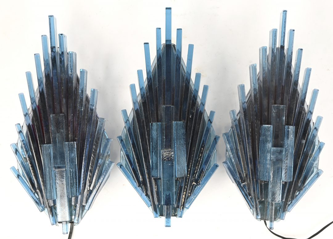 Drie wandlampen van lichtblauw kunststof op metalen houder. Jaren zeventig. Model Cebo.