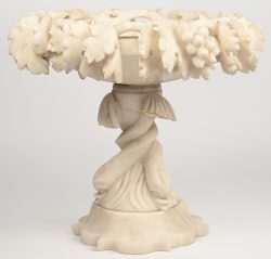 An alabaster coupe on foot decorated with grapevines. One fringe broken. -