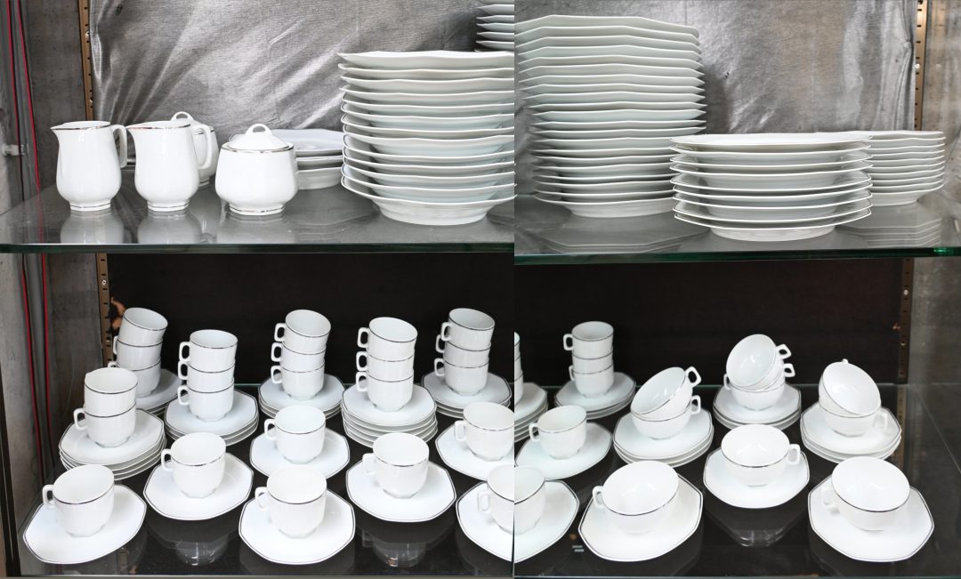 A comprehensive dinner service with rose decorations. 'Made in Malaysia'. Tea & coffee set with sugar and milk pot for 6 people. Small and large coffee cups and large tea cups. Six soup bowls, five dinner plates, thirteen dessert plates, and three dishes. 77 pieces. -