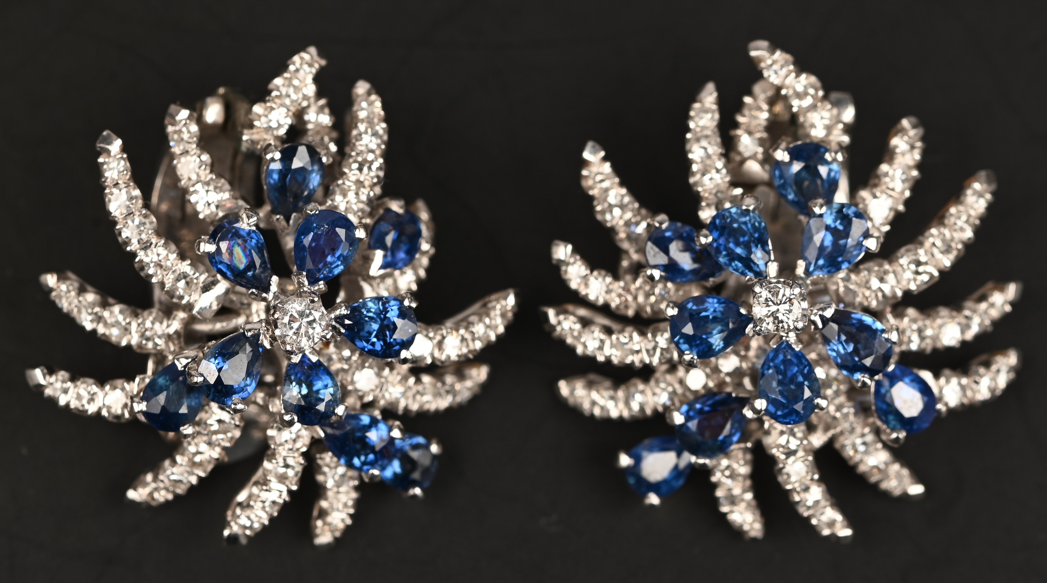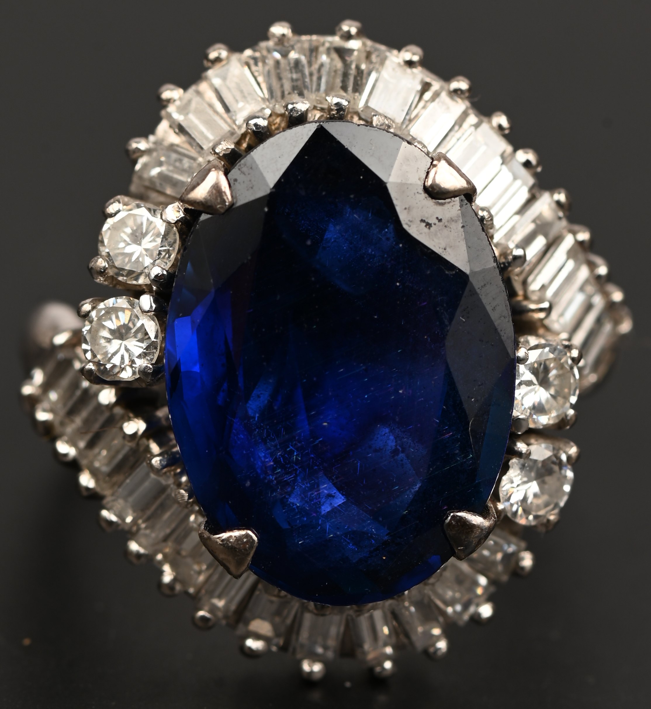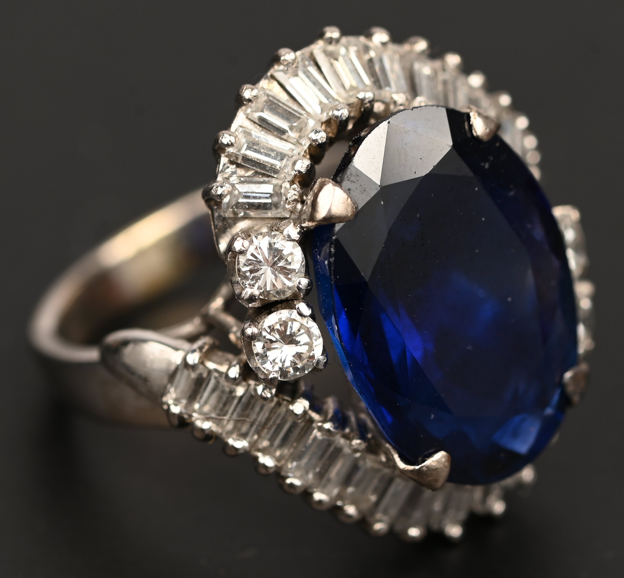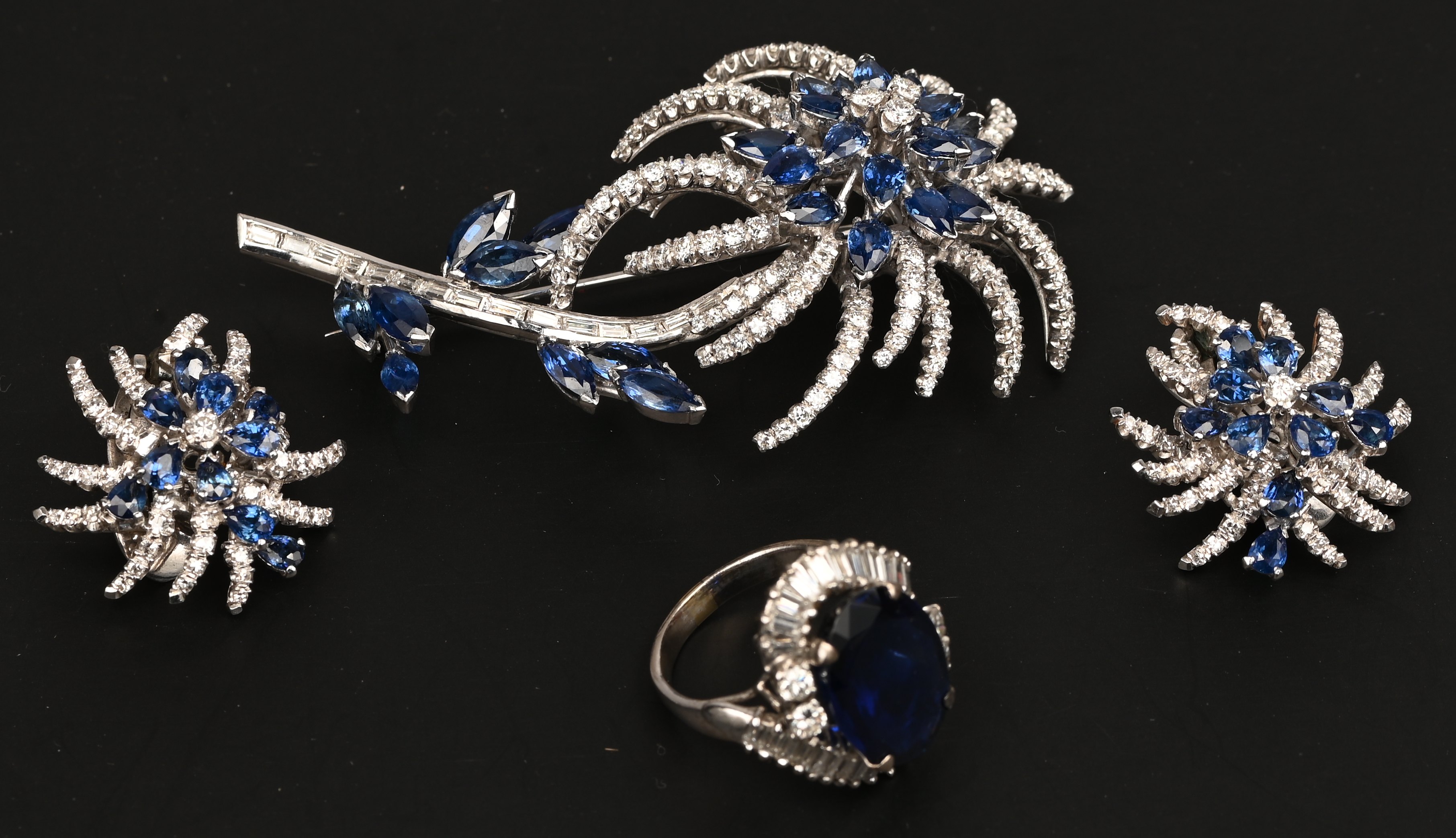 A 14 kt white gold brooch set with marquise-cut sapphires totaling approximately 3 ct. and brilliant-cut diamonds and diamond baguettes totaling approximately 3 ct., earrings set with sapphires totaling approximately 1 ct. and brilliant-cut diamonds totaling approximately 1.50 ct., a 14 kt white gold ring set with diamond baguettes and brilliant-cut diamonds totaling approximately 1.50 ct. and a synthetic sapphire. Hotel Rama Arcade.