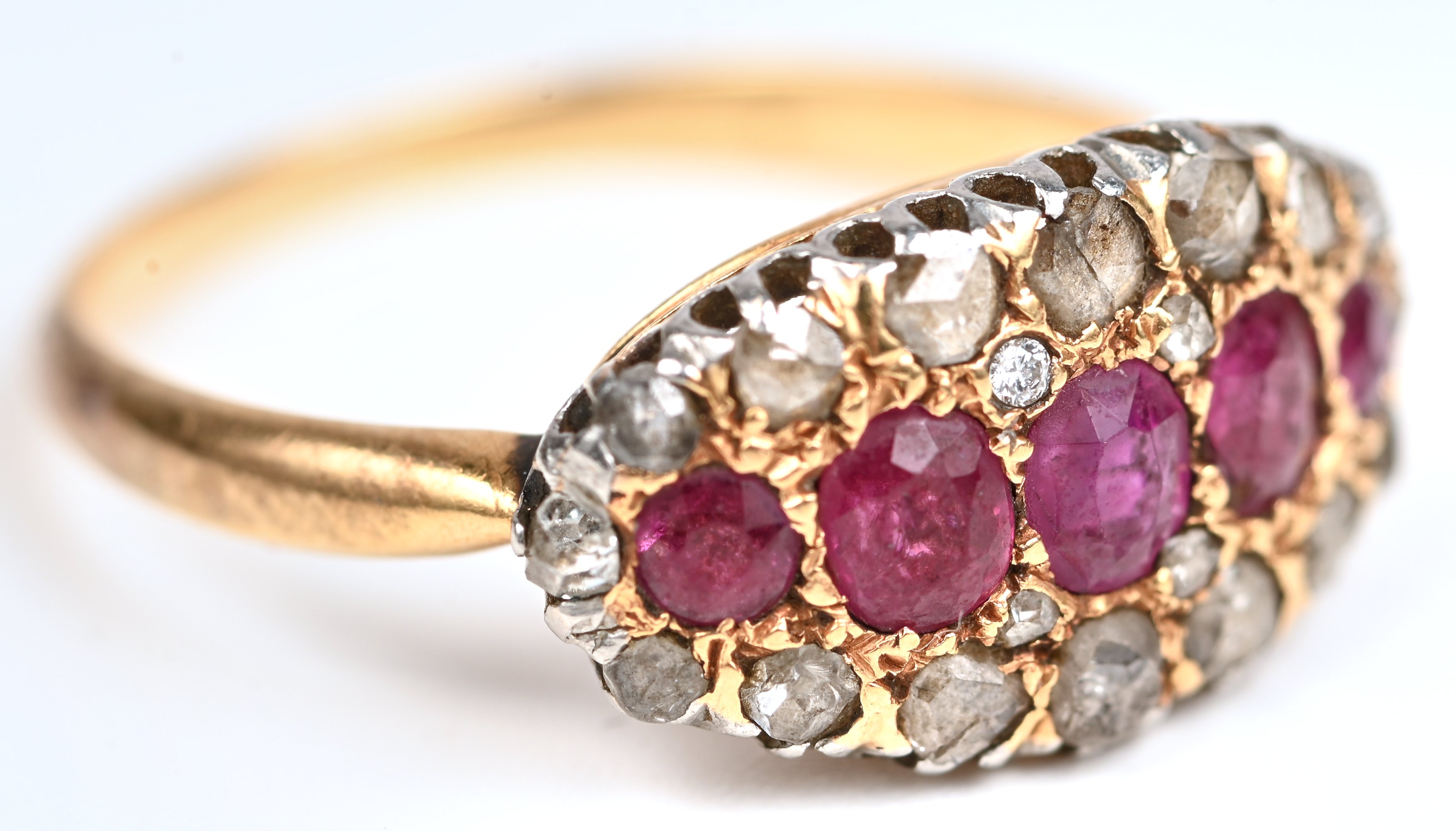 Een 18 karaats geelgouden ring bezet met diamanten oude slijp met een gezamenlijk gewicht van +- 0,30 ct. en robijnen met een gezamenlijk gewicht a-van +- 0,40 ct.