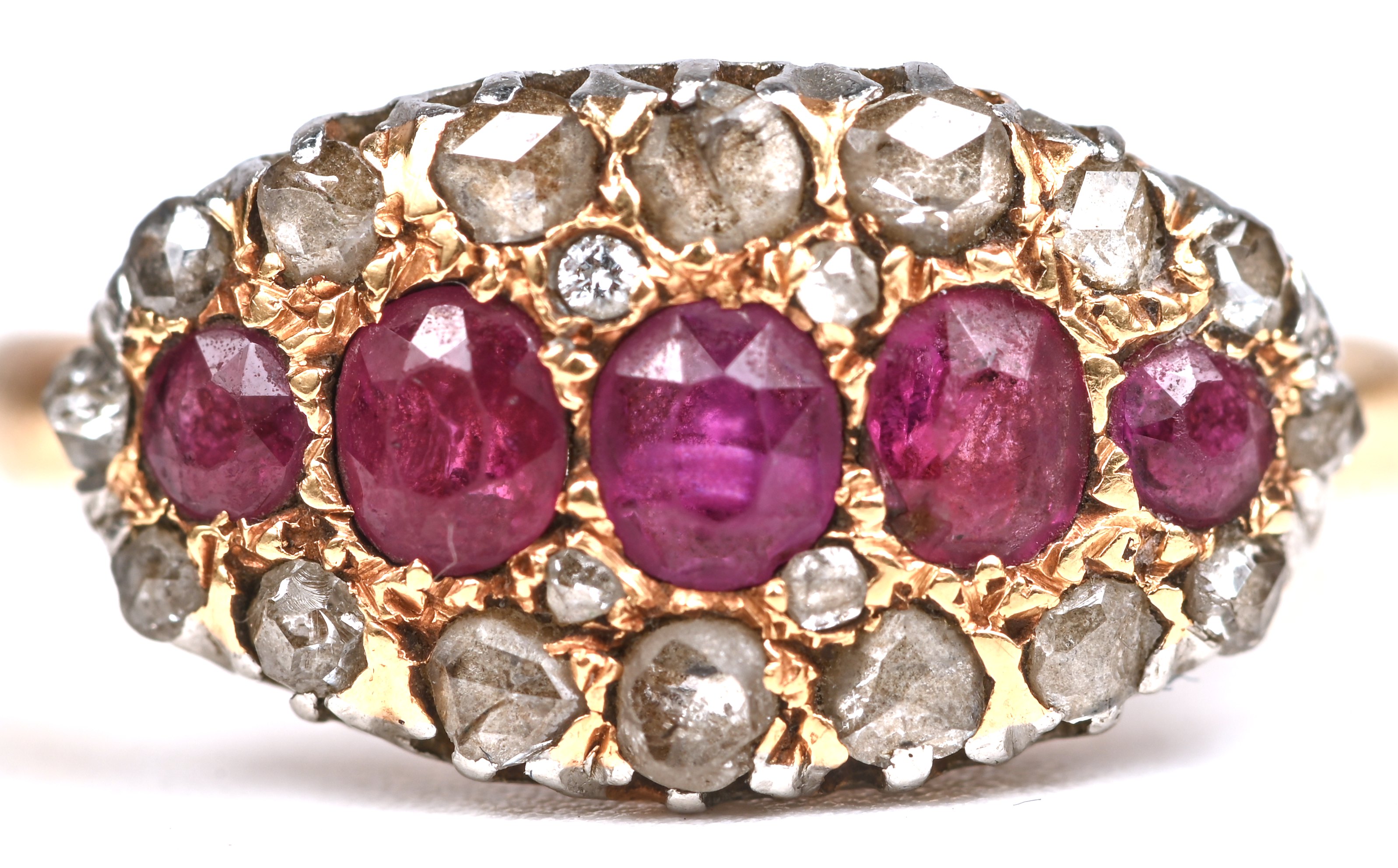 An 18 karat yellow gold ring set with old cut diamonds totalling approximately 0.30 ct. and rubies totalling approximately 0.40 ct.