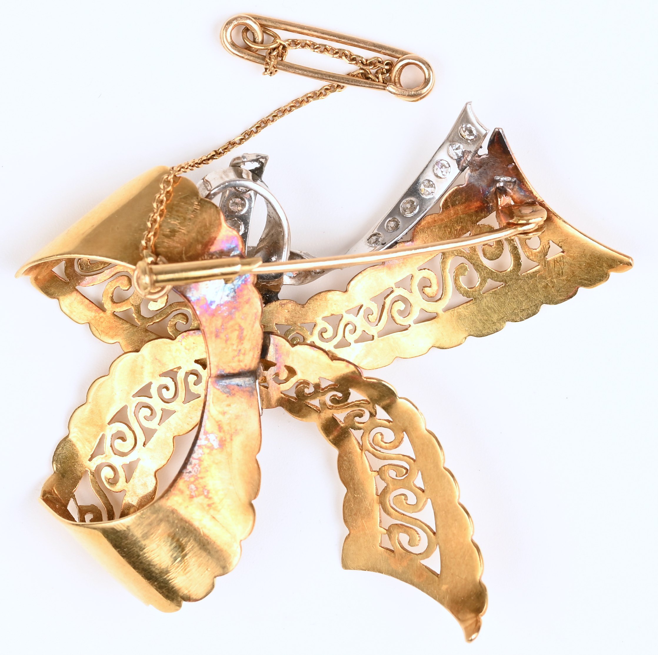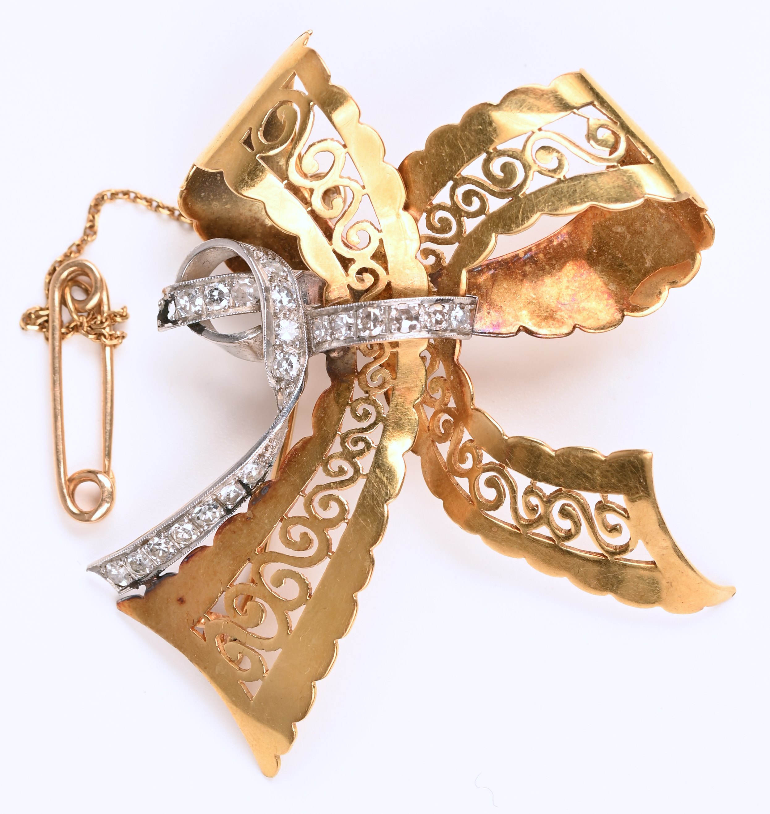 Een 18 karaats wit- en geelgouden broche in de vorm van een strik bezet met diamanten met een gezamenlijk gewicht van +- 0,38 ct. (1 steentje ontbreekt).