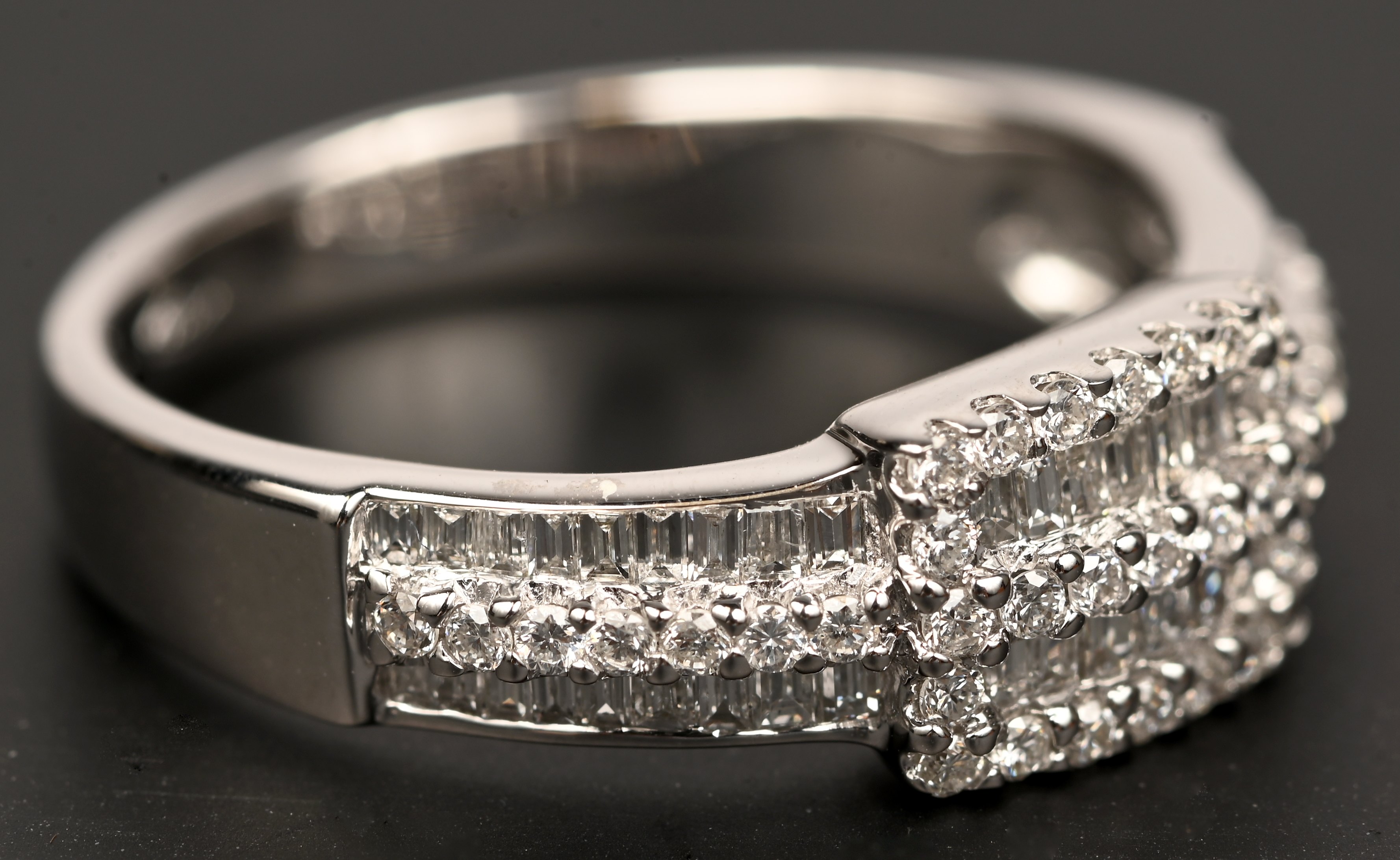 An 18 karat white gold ring set with brilliant and diamond baguettes with a total weight of approximately 0.72 ct.