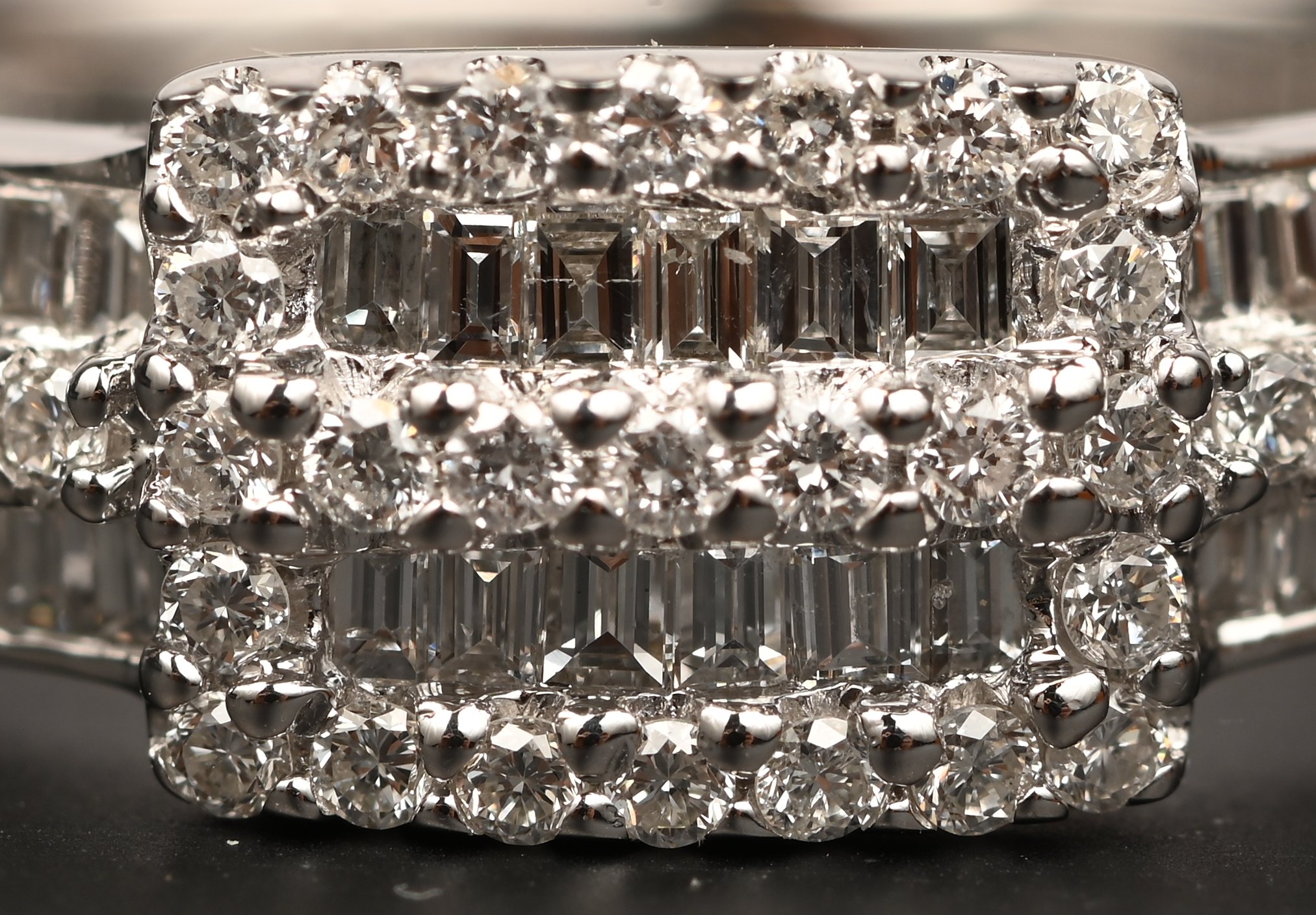 Een 18 karaats witgouden ring bezet met briljanten en diamant baguetten met een gezamenlijk gewicht van +- 0,72 ct.