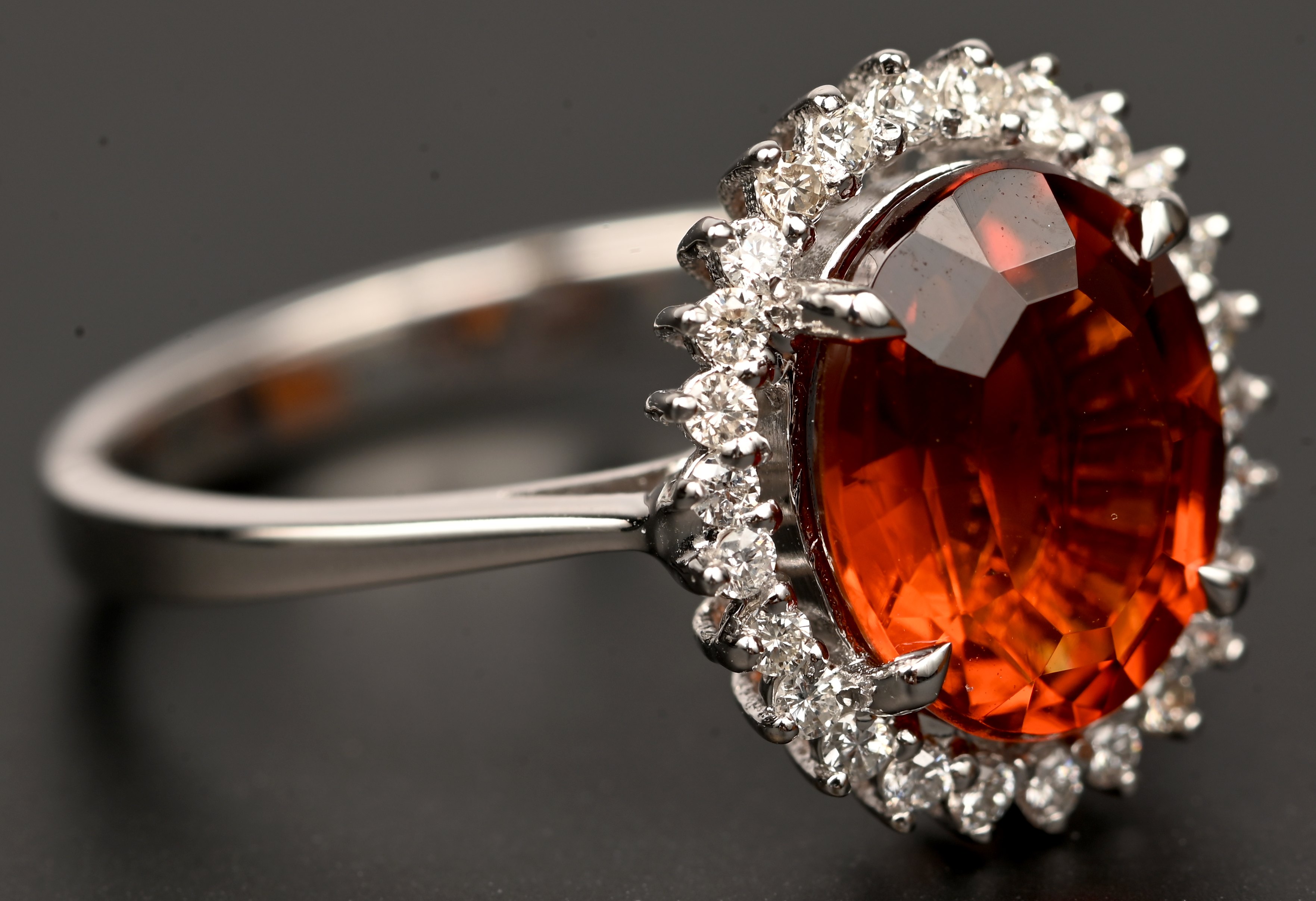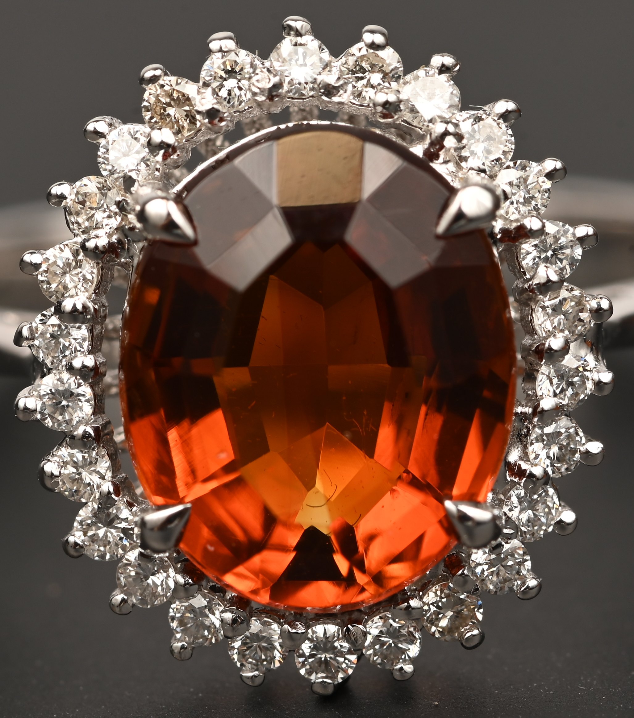 An 18 karat white gold ring set with a central citrine of approximately 2.53 ct. and diamonds weighing a total of approximately 0.52 ct. FVVS.