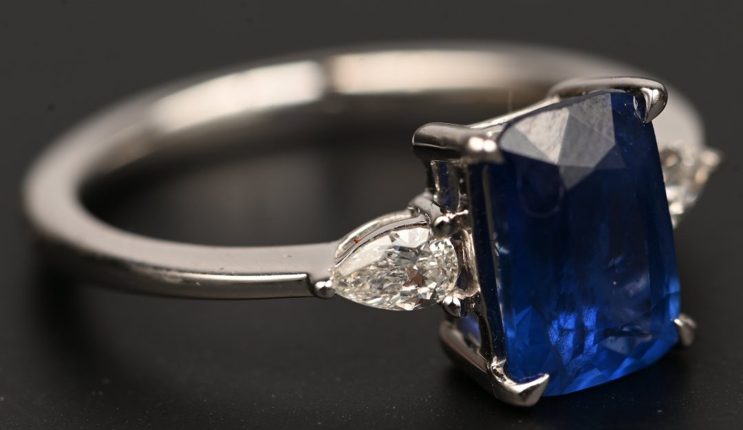 Een 18 karaats witgouden ring bezet met een centrale saffier van +- 2,20 ct. en twee briljanten paer shape met een gezamenlijk gewicht van +- 0,25 ct. FG. Met certificaat.