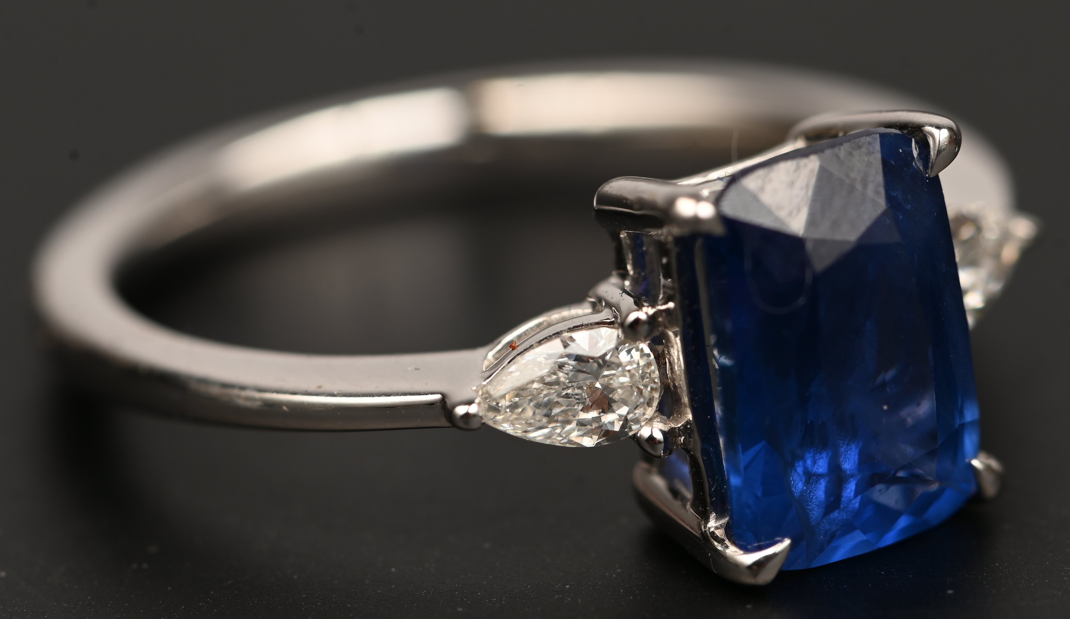 An 18 karat white gold ring set with a central sapphire of approximately 2.20 ct. and two pear-shaped diamonds with a total weight of approximately 0.25 ct. FG. With certificate.