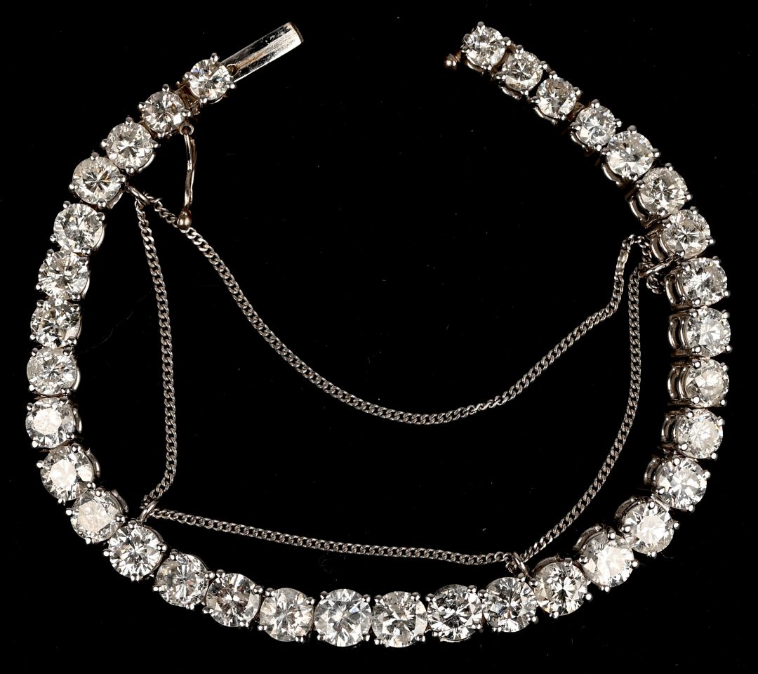 An 18 karat white gold riviera bracelet set with 34 brilliant cut diamonds with a total weight of approximately 17.80 ct. GH P1 P2.