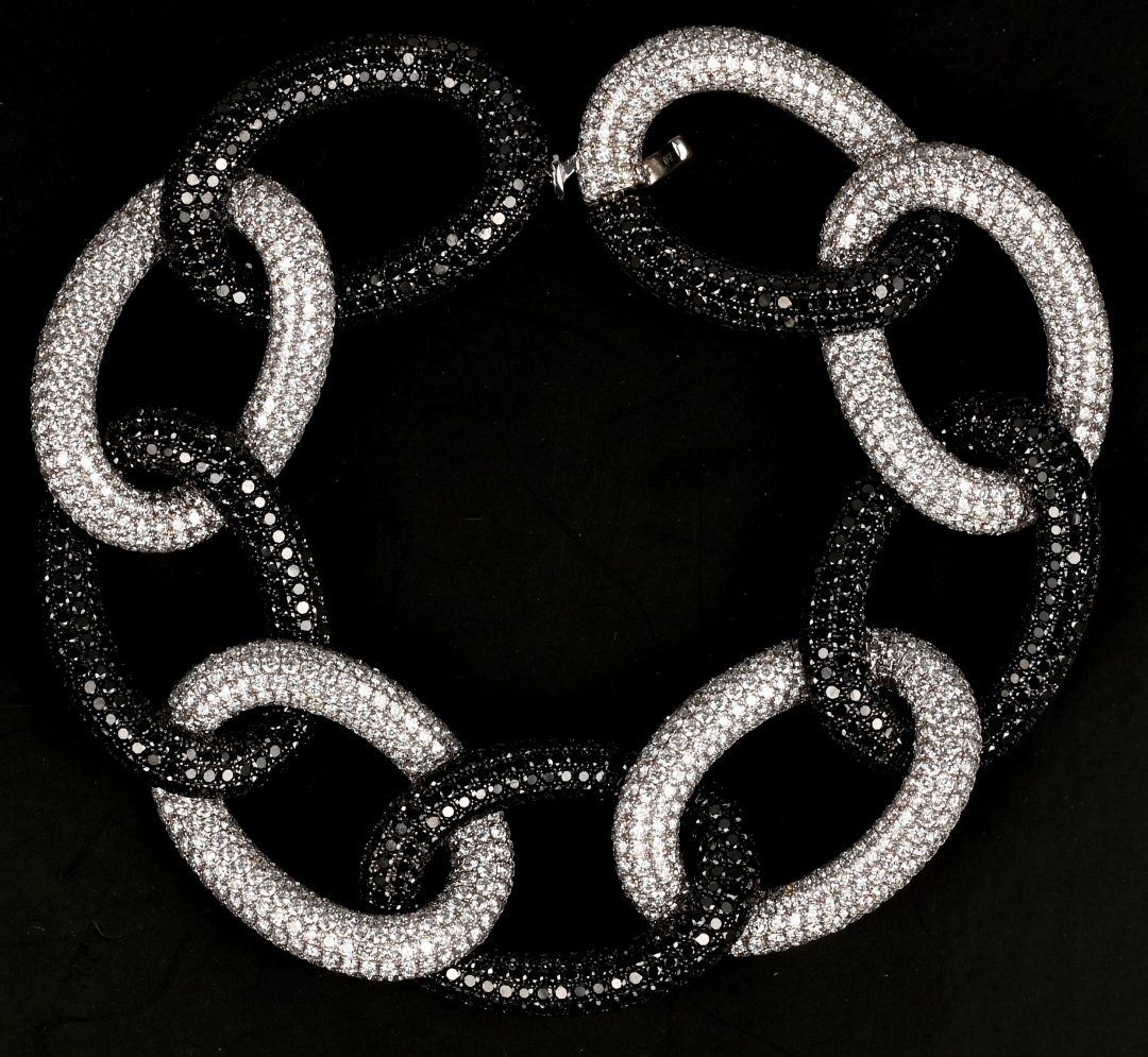 An 18 karat white gold link bracelet set with brilliant-cut diamonds with a total weight of approximately 18.01 ct. and black diamonds with a total weight of approximately 20.32 ct. With certificate.