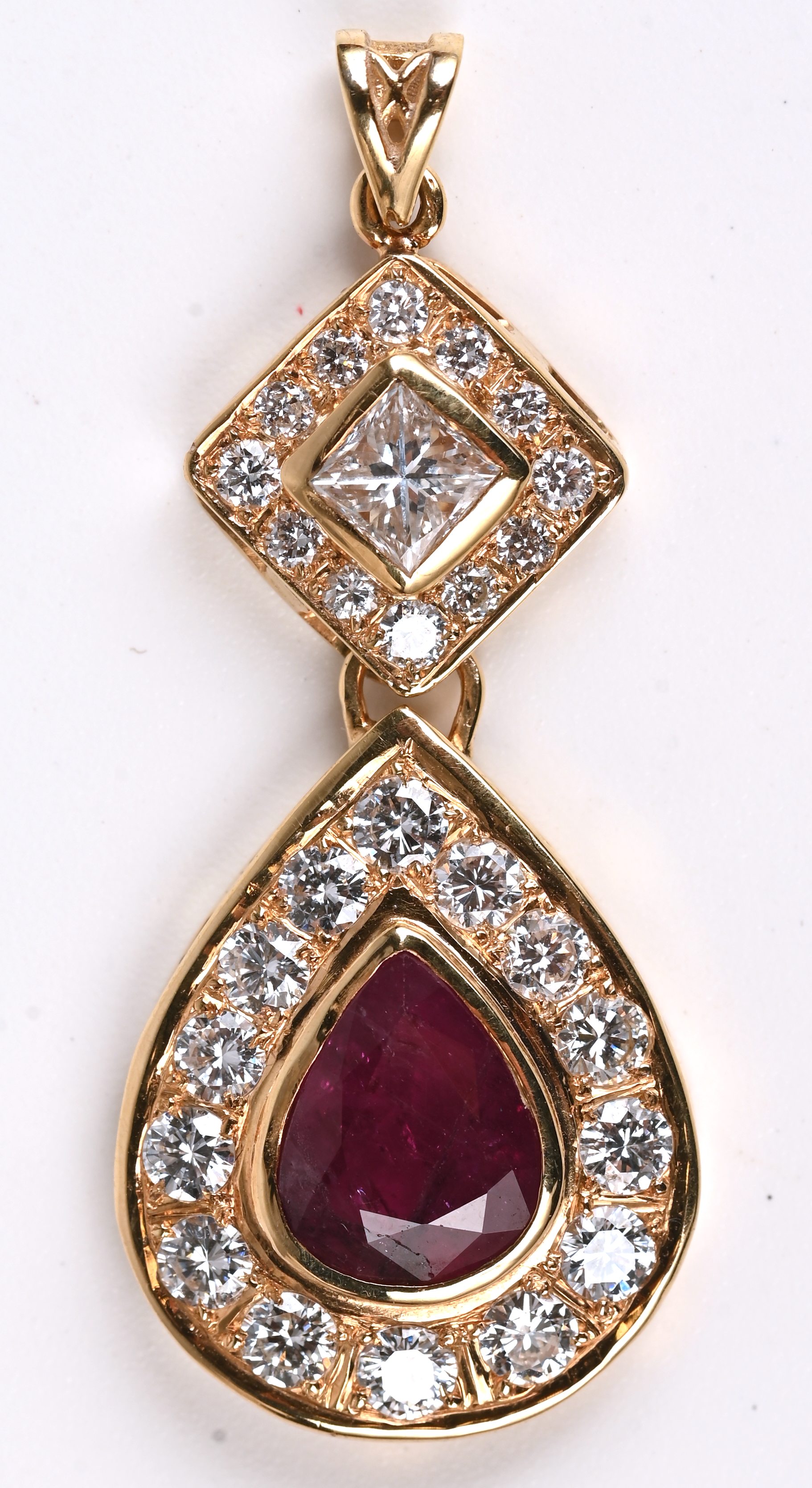 A 18 kt yellow gold pendant set with a pear-shaped ruby of approx. 1.30 ct and brilliant-cut diamonds and princess-cut diamonds with a total weight of approx. 1.50 ct.