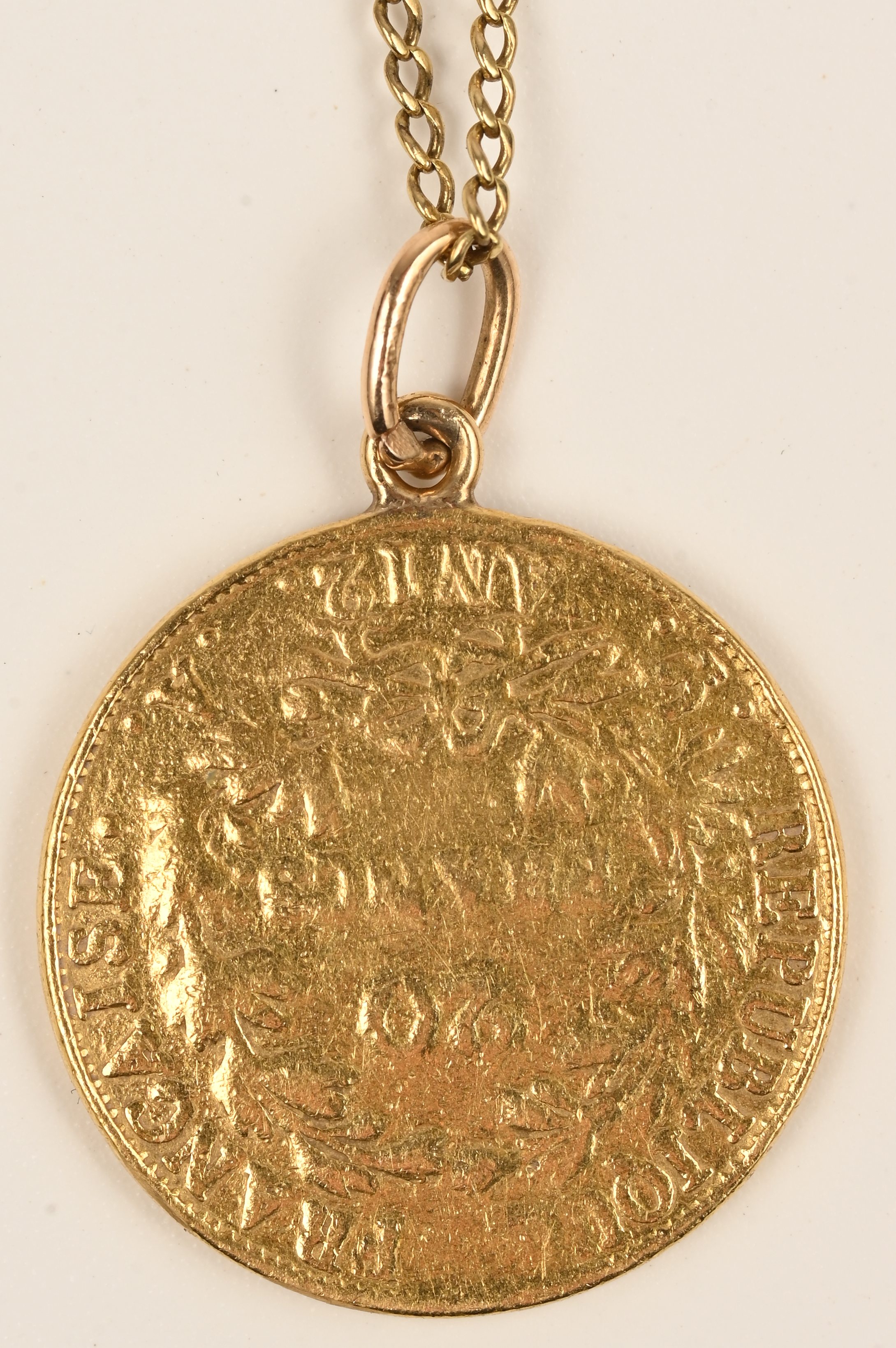 An 18 kt yellow gold necklace with pendant set with a 999 kt yellow gold coin depicting Napoleon. 20 Francs.