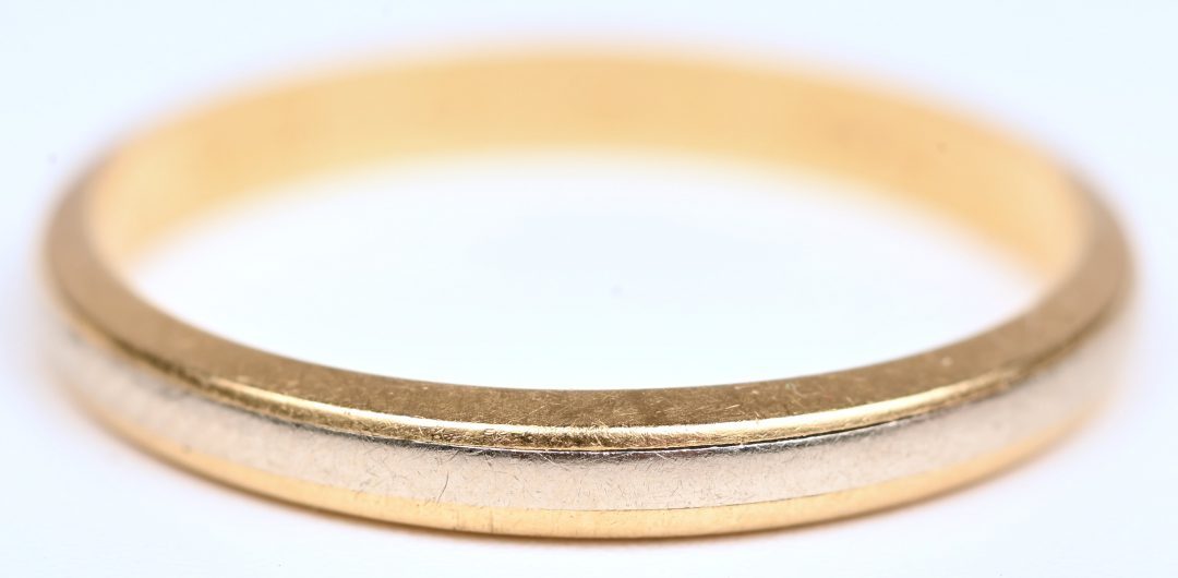 An 18 kt white and yellow gold ring set with coral and imitation stones. -