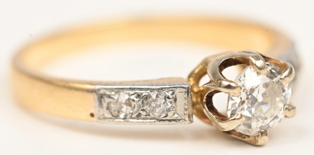 Een 18 kt wit en geelgouden ring bezet met briljanten met een gezamenlijk gewicht van +- 0,30 ct.
