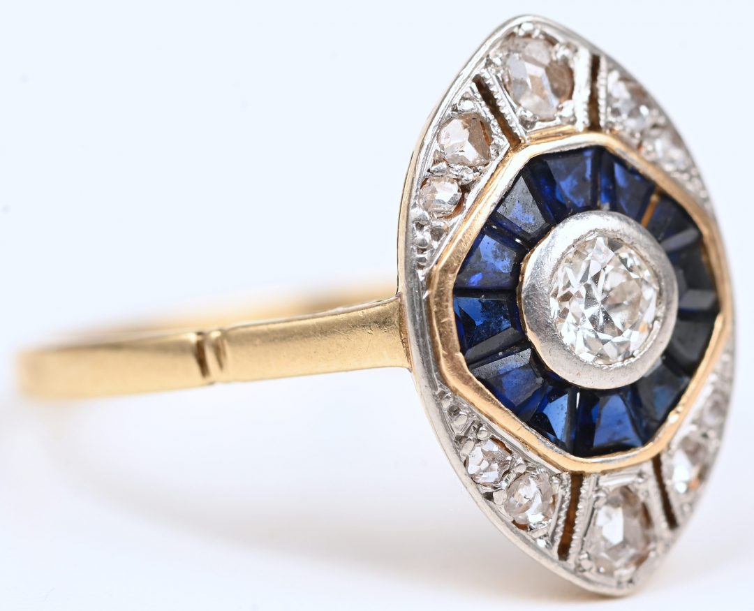Een 18 kt witgouden art deco ring bezet met diamanten met een gezamenlijk gewicht van +- 0,60 ct. en gecalibreerde saffieren met een gezamenlijk gewicht van +- 0,40 ct.