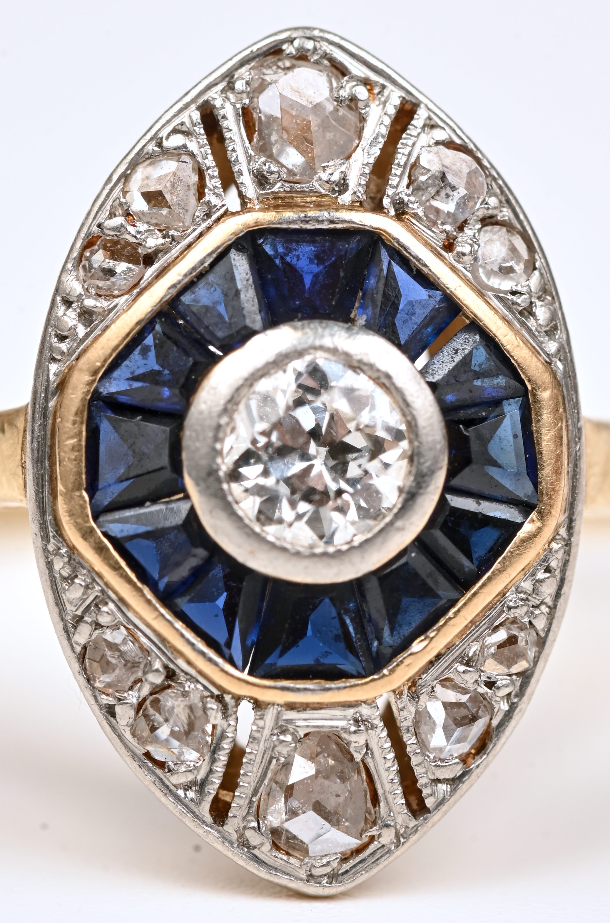 An 18 kt white gold art deco ring set with diamonds totaling approximately 0.60 ct. and calibrated sapphires totaling approximately 0.40 ct.