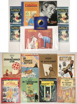 A collection of Tintin-related comics and items. Includes five albums from the sixties and seventies by Ed. Casterman. Also, Alfa-Kunst by Ed. Casterman 2004, Kuifje in Tibet by Ed. De Morgen Bibliotheek 2001, 2 Tintin game books, a booklet for "The Sun Temple" musical, "The Jewels of Bianca Castafiore" in four small volumes by Ed. Nieuwsblad 2004, and a poster by Raymond Savignac for Tintin Orange (27 x 37 cm version from the 1980s).