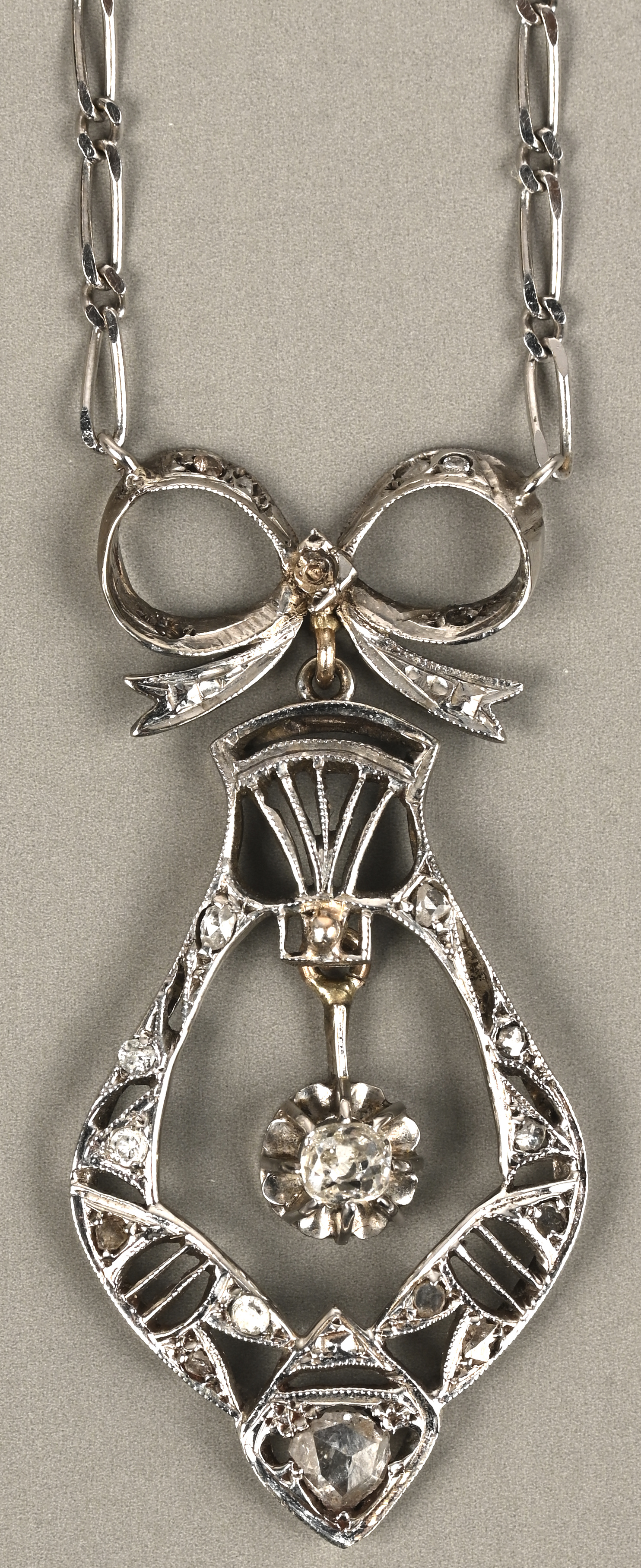 An 18kt white gold chain with a pendant set with old cut diamonds with a total weight of approximately 0.30 ct.