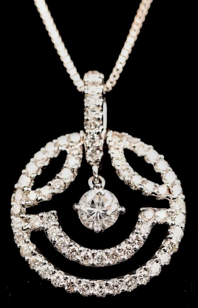 Een 18 kt witgouden ketting met hanger bezet met diamanten en baguettes met een gezamenlijk gewicht van +- 0,60 ct.