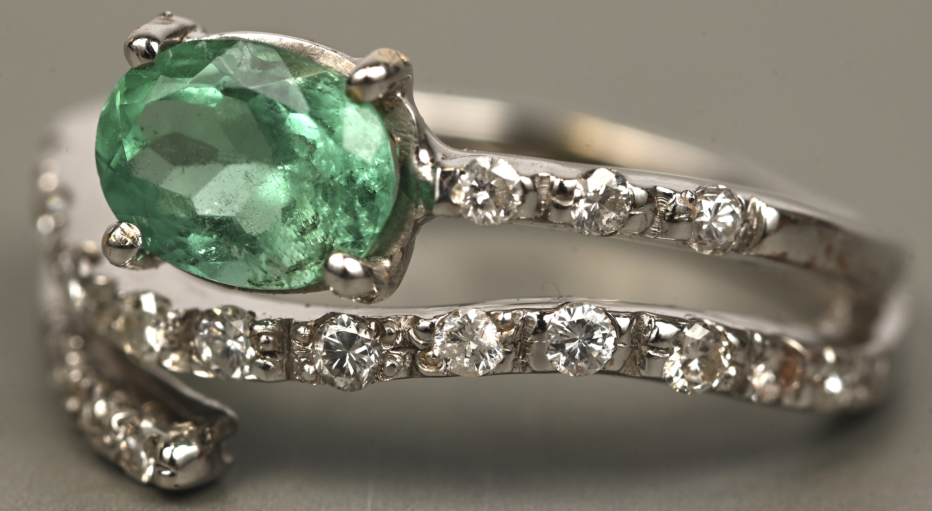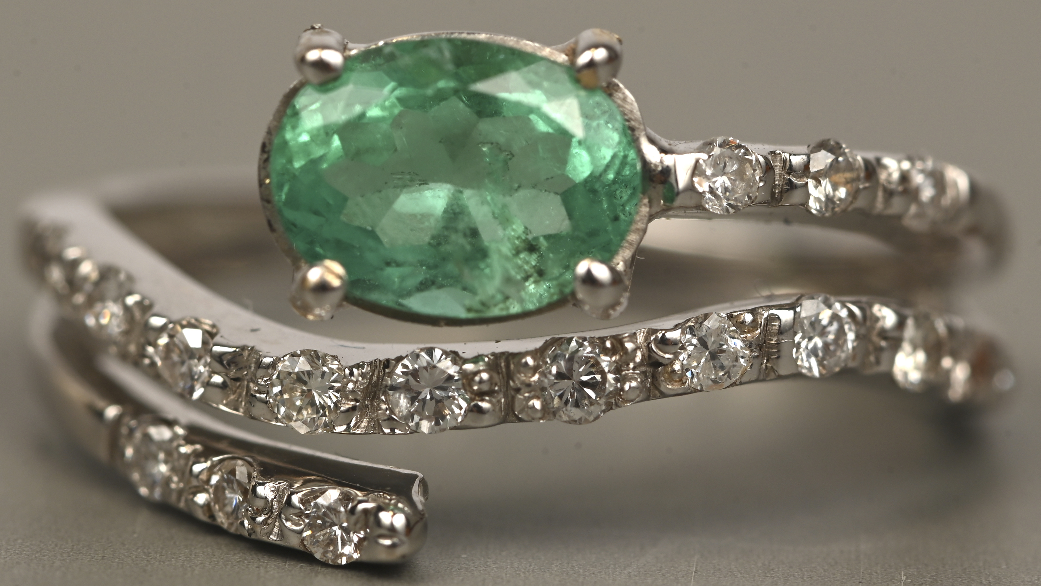 An 18 kt white gold ring set with diamonds totaling approximately 0.20 ct. and a central emerald of approximately 1 ct.