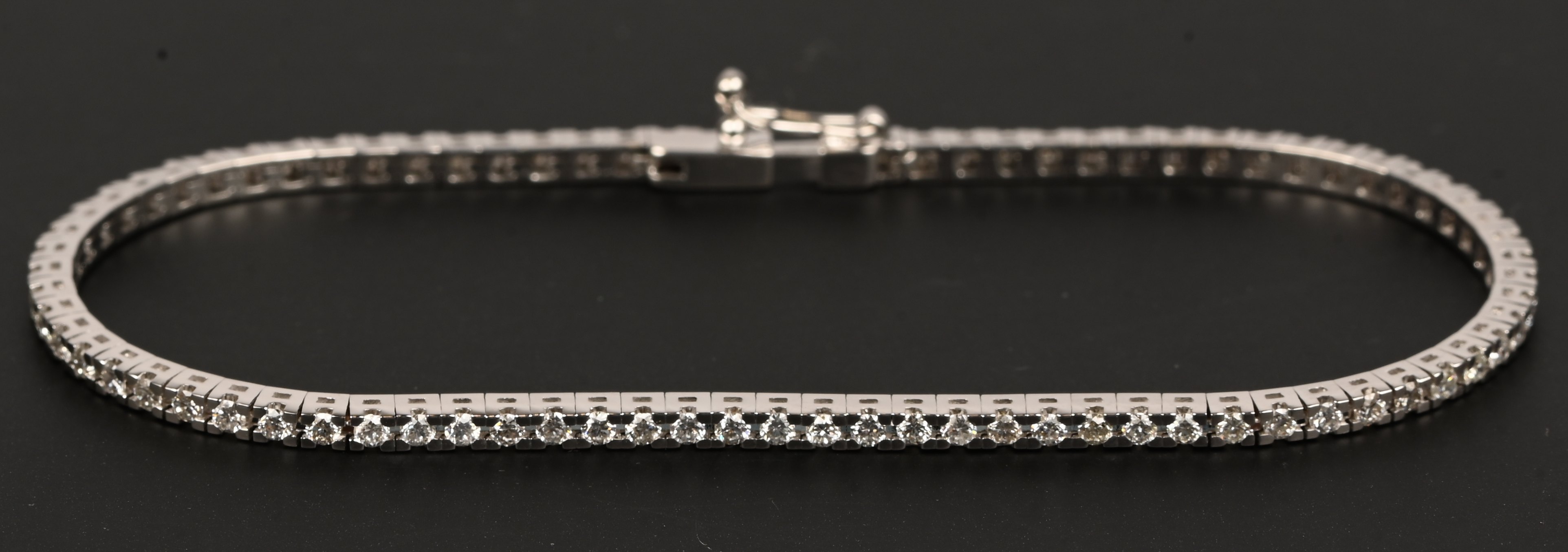 Een 18 kt. witgouden tennisarmband met briljanten met een gezamenlijk gewicht van +- 1,82 ct. FVVS.