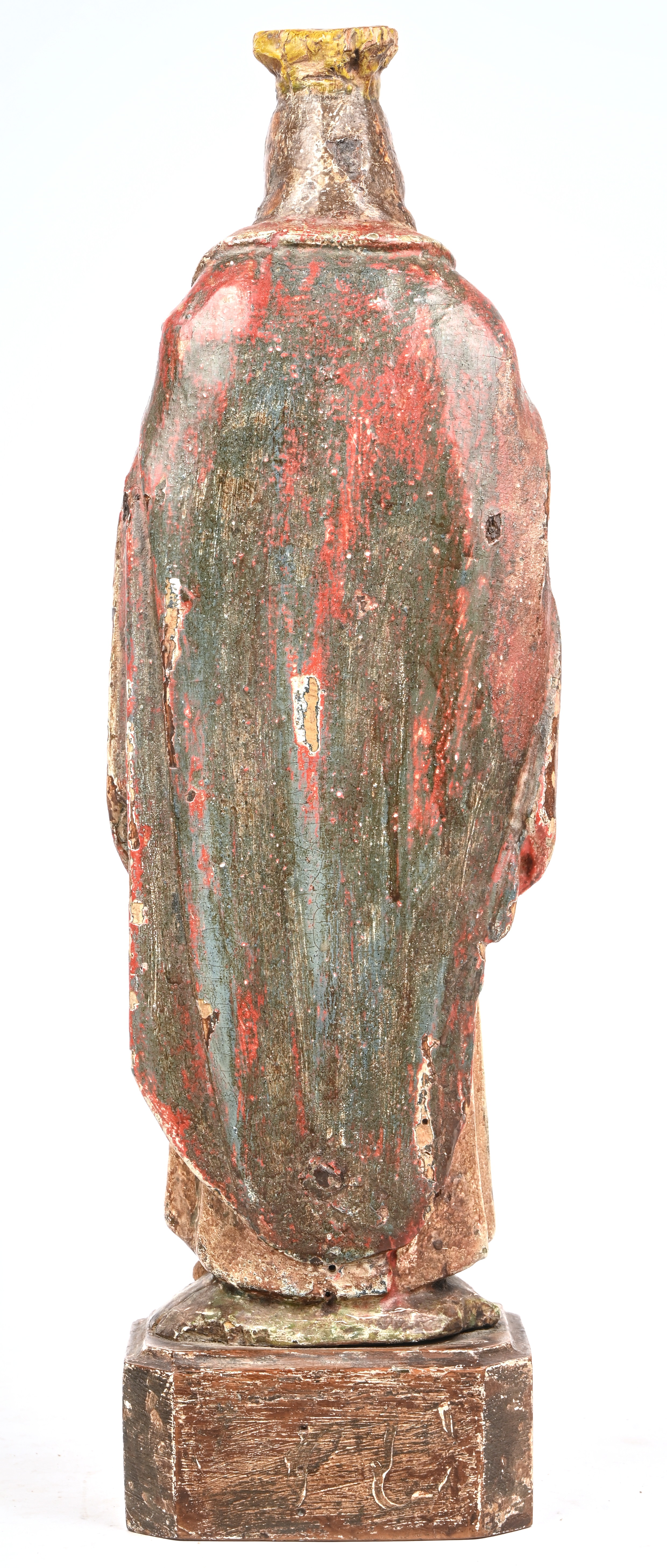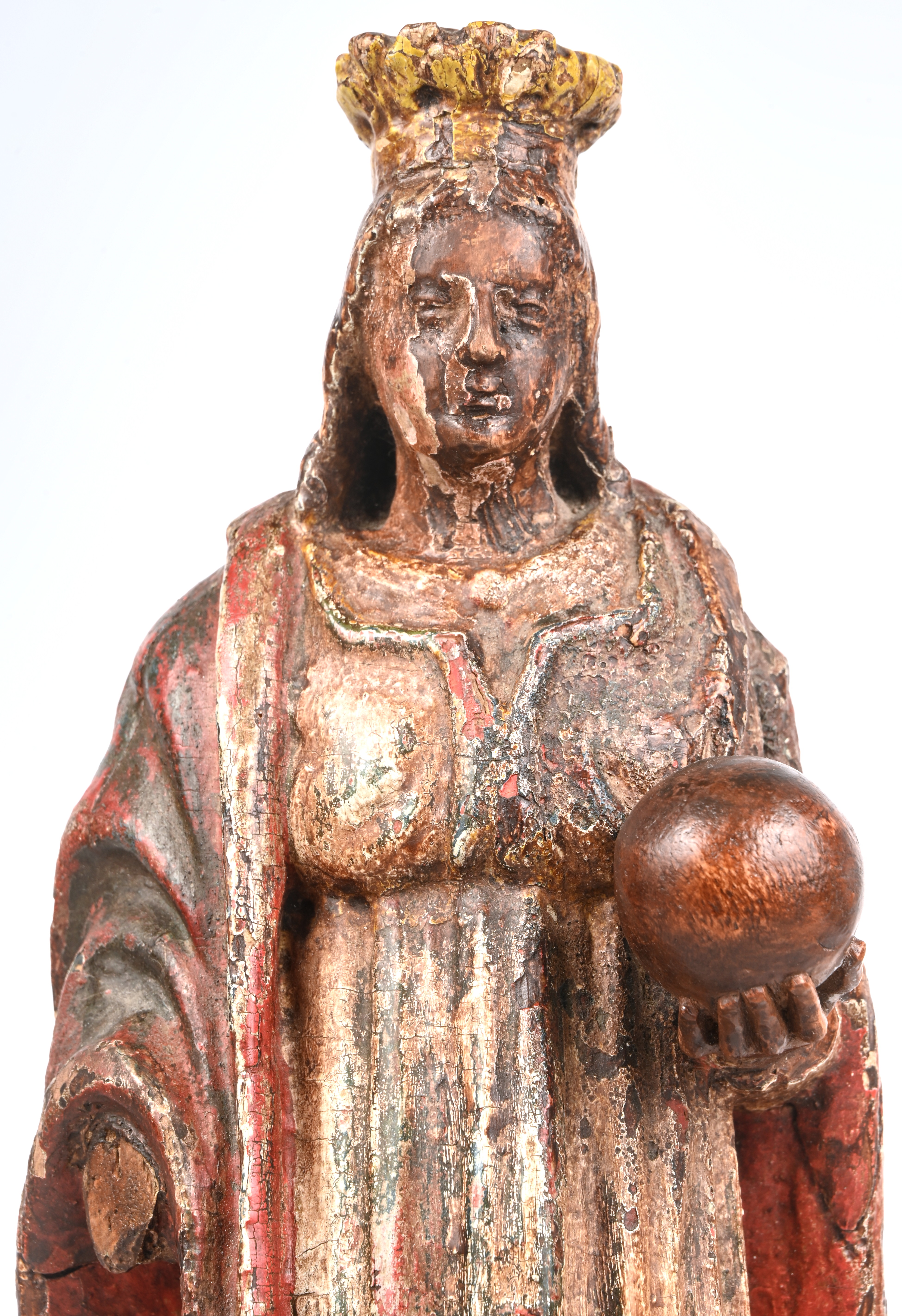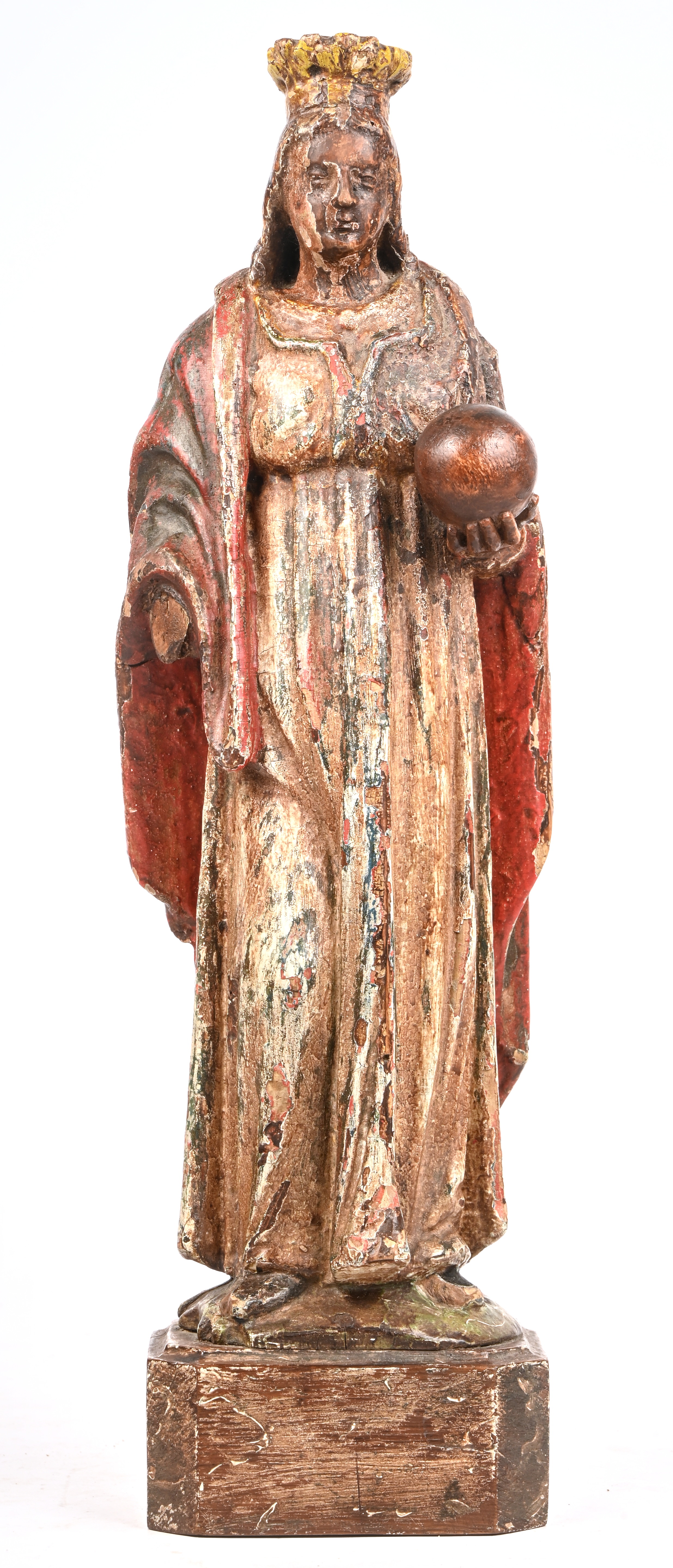 Een polychroom gipsen altaarstuk met de voorstelling van Jezus, Dismas en Hestas, gekruisigd op de berg Golgotha.