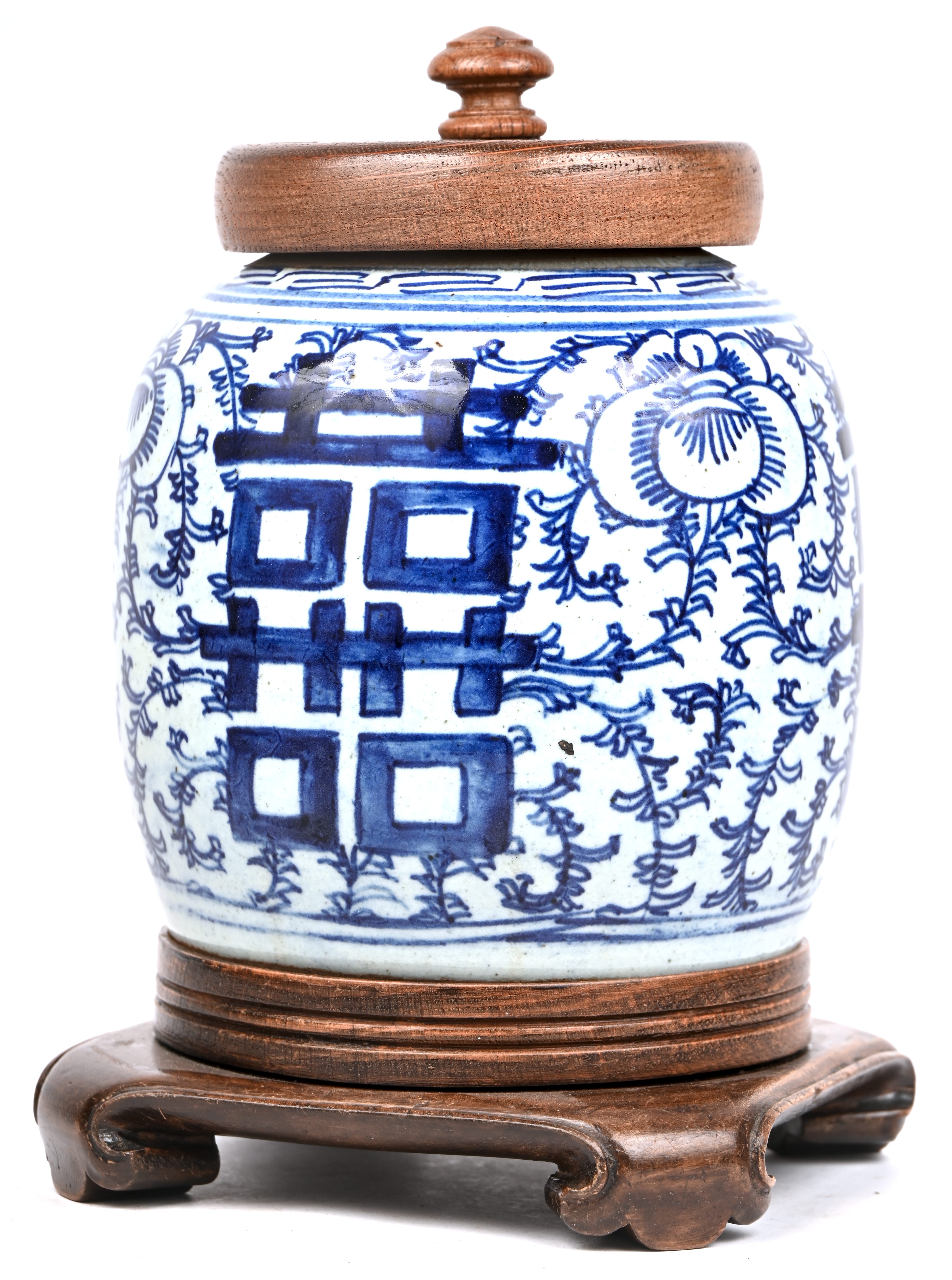 Een 19e eeuwse Chinees porseleinen gemberpot met houten sokkel en deksel.