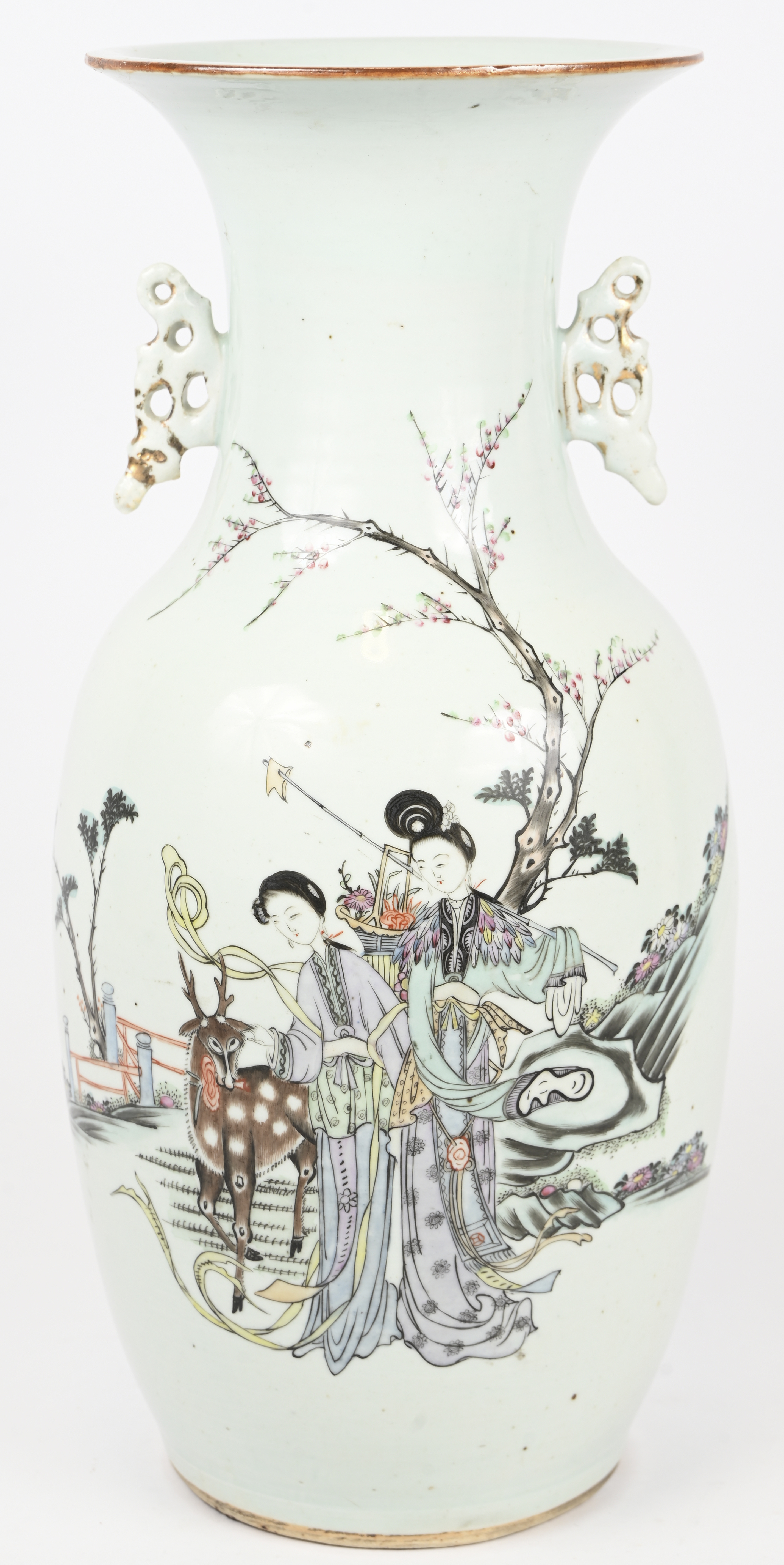 A pair of porcelain Cantonese lidded vases with floral decoration and gilded details. Small chipping on bottom edge.No longer availableDim. 33cmEstimate: € 80 / 120 -