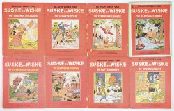 #193Acht stripalbums: Willy Vandersteen, Suske en Wiske, rode ongekleurde reeks (Ed. Standaard Boekhandel). “Het Zingende Nijlpaard” (1952), “De Sterrenplukkers” (1953), “De Tamtamklopper” (onvolledige kaft), “De Kleppende Klipper” (1960), “De Straatridder” (1956, 1ste ed.), “De Spokenjagers” (1956, 1e ed.), “De Mottenvanger” (1957, 1e ed.), “Het Sprekende Testament” (1959). Redelijk tot goede staat (op 1 na).