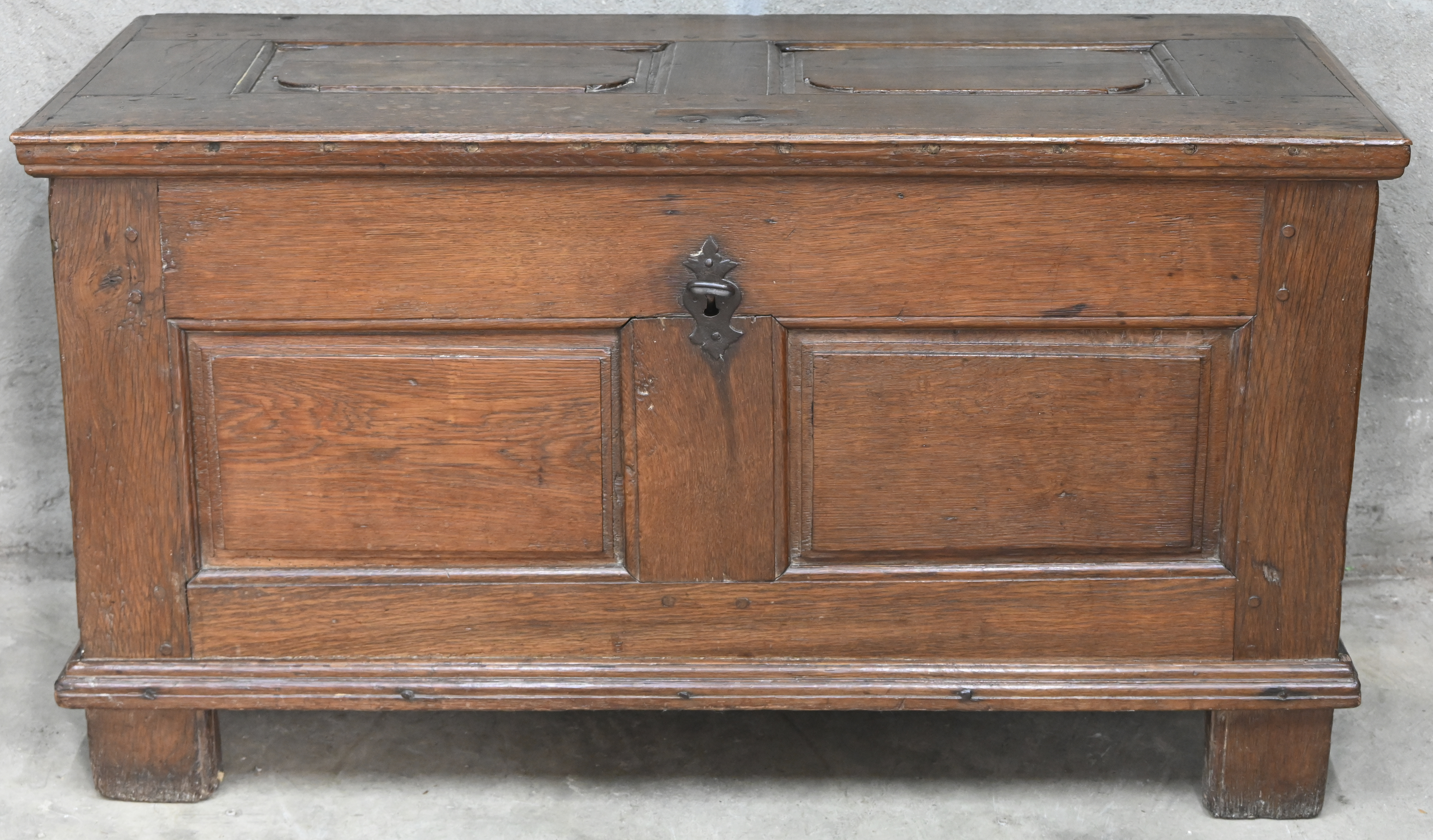 #129Een grote eikenhouten koffer met een gegalbeerd deksel en smeedijzeren beslag. XIXe eeuw.