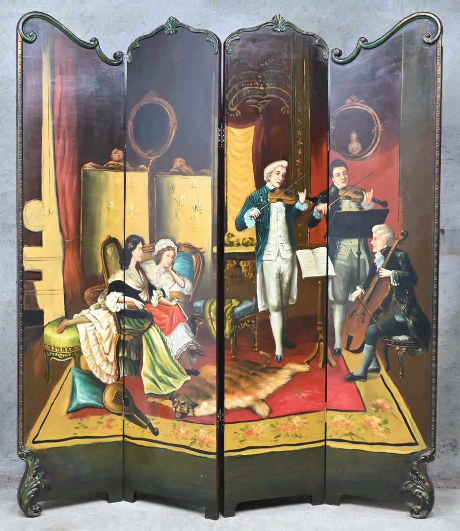 A 4-piece wooden room divider in Louis XV style, painted with a living room concert in a romantic setting.