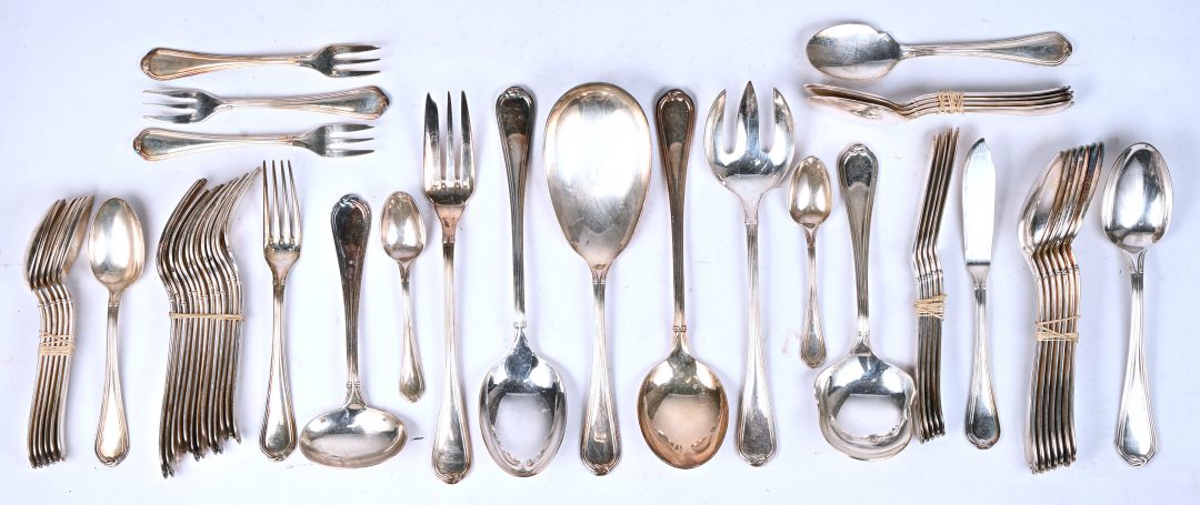 #131Christofle FranceEen 125-delig verzilverd metalen bestek bestaande uit 14 grote vorken, 17 kleine vorken, 17 gebakvorken, 12 grote messen, 18 kleine messen, 16 grote lepels, 16 kleine lepels, 10 koffielepels en 5 stuks serveerbestek. Gemerkt.