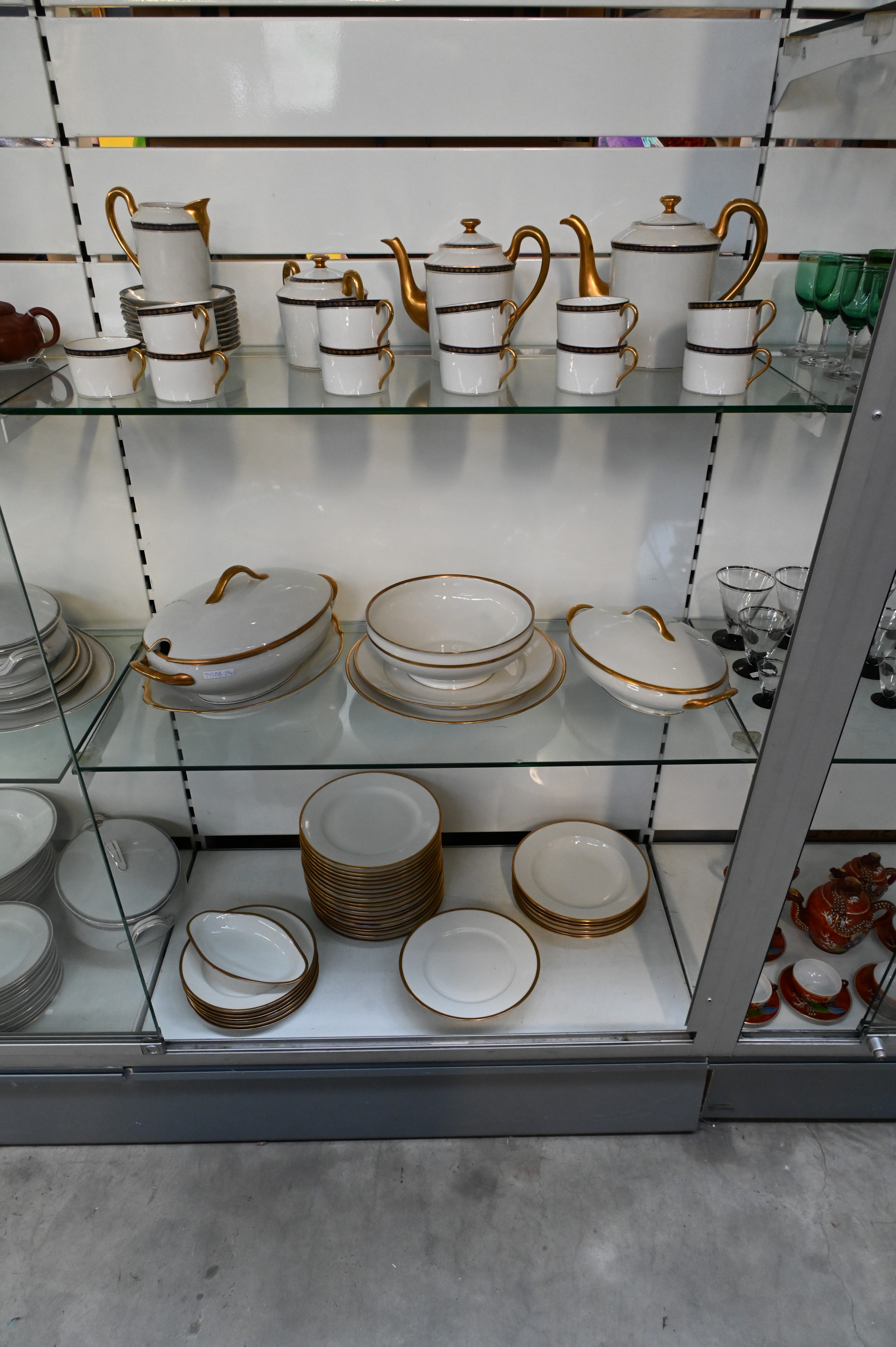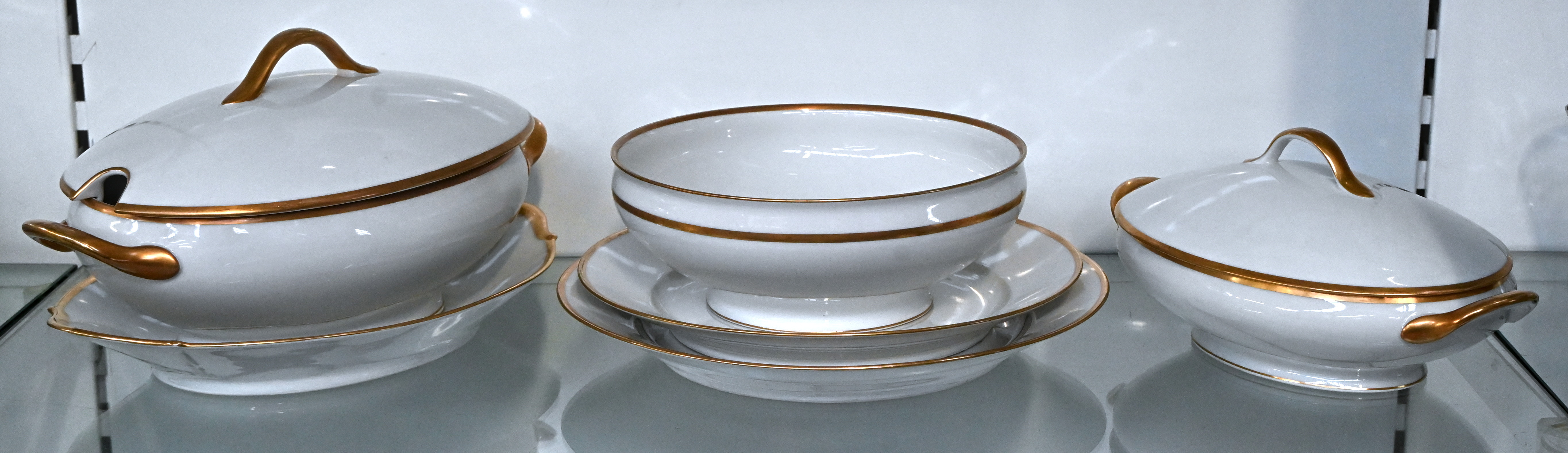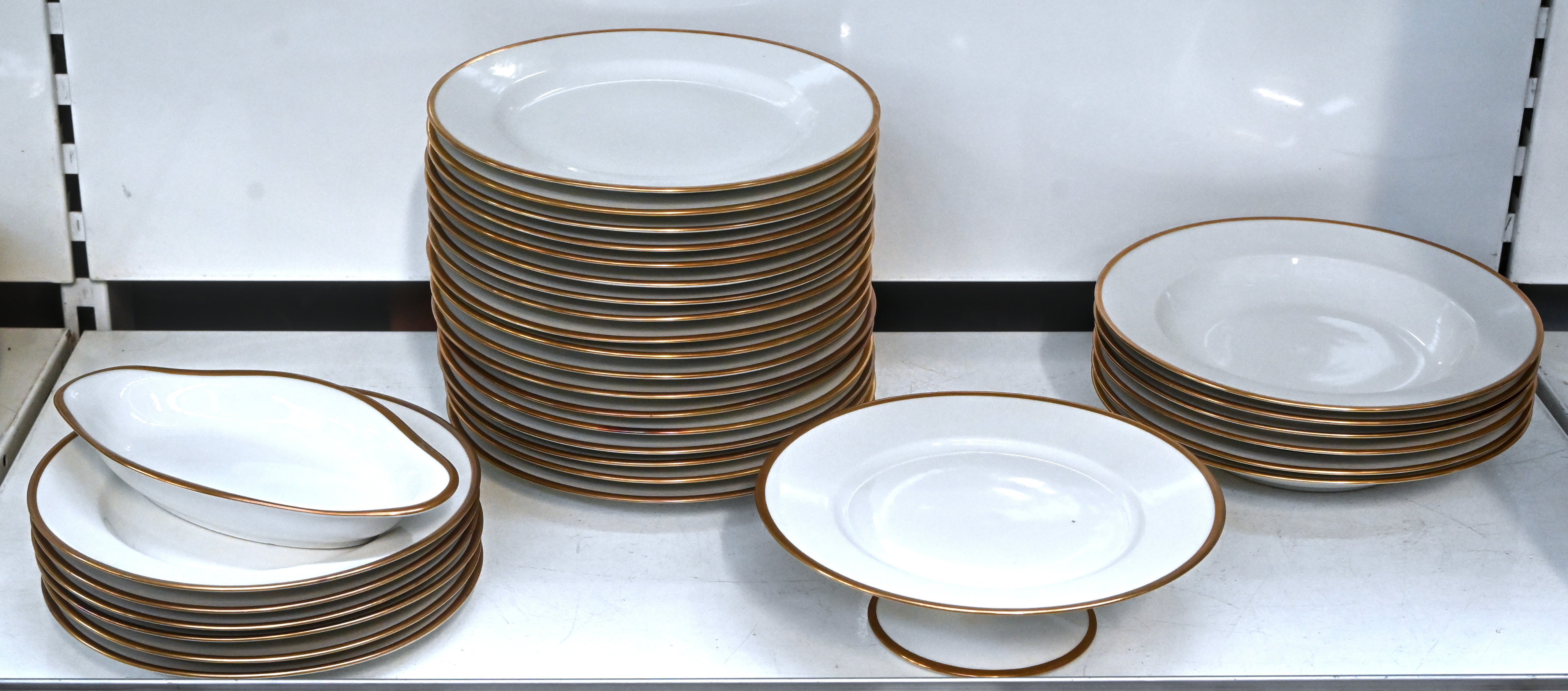 A porcelain dinner service with black and gilded edges including three large plates, 32 flat plates, 15 deep plates, 12 dessert plates, three lidded bowls, two sauce boats, and a praline dish. -