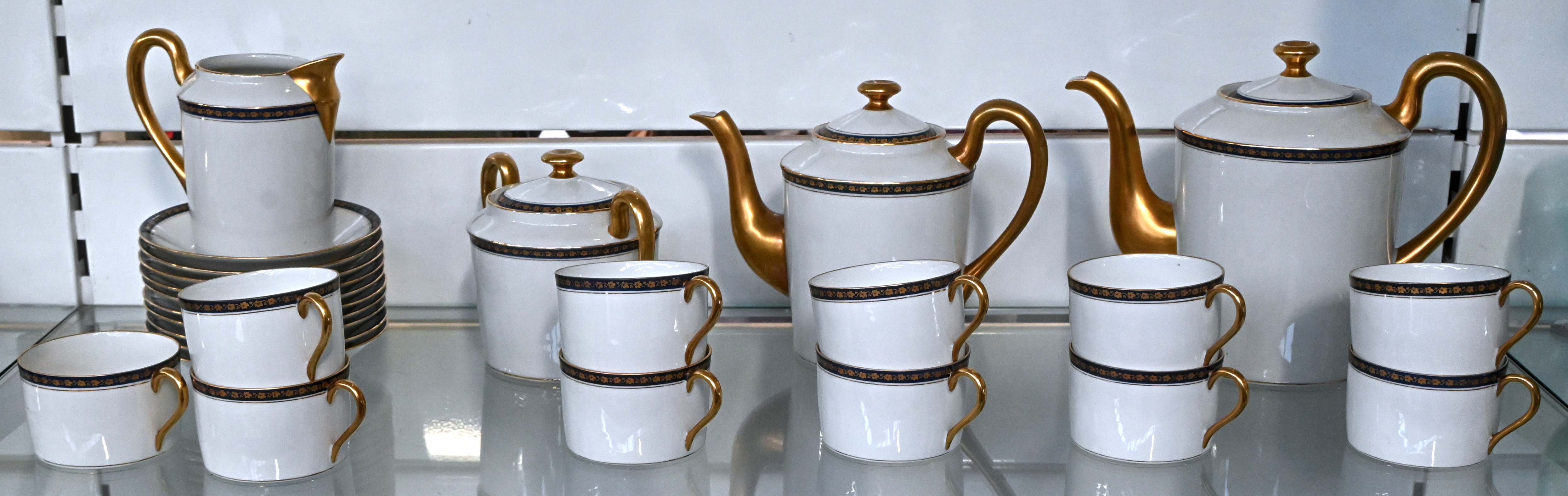 #300Epiag RoyalEen eetservies van porselein met zwarte en vergulde randen waaronder, drie grote borden, 31 platte borden, 15 diepe borden, 12 dessertborden, drie kommen met deksel, twee sauskommen en een pralinebordje.