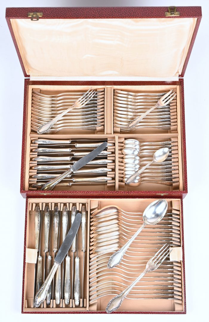 Een 84-delig verzilverd metalen bestek voor 12 personen in bijhorende cassette.