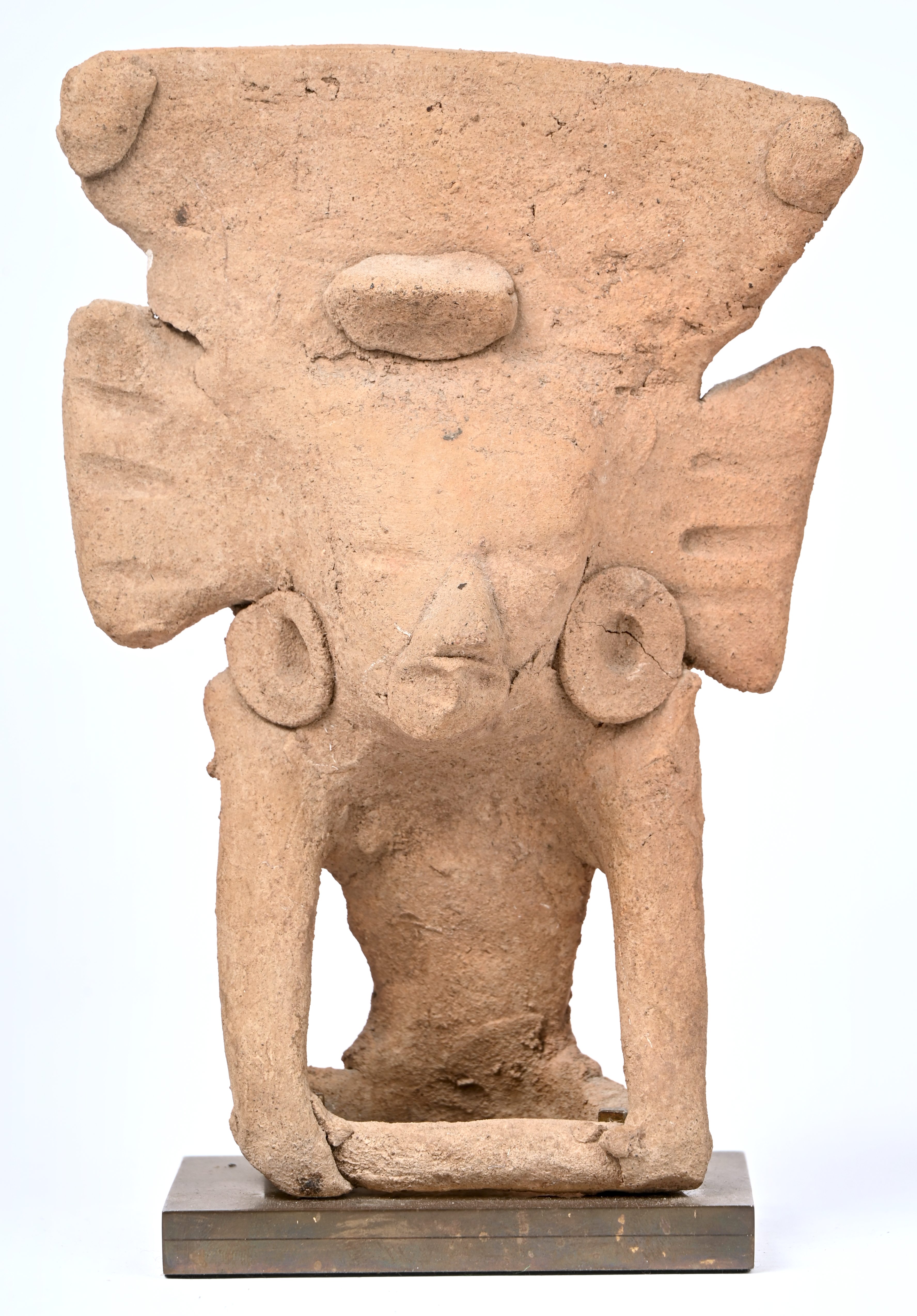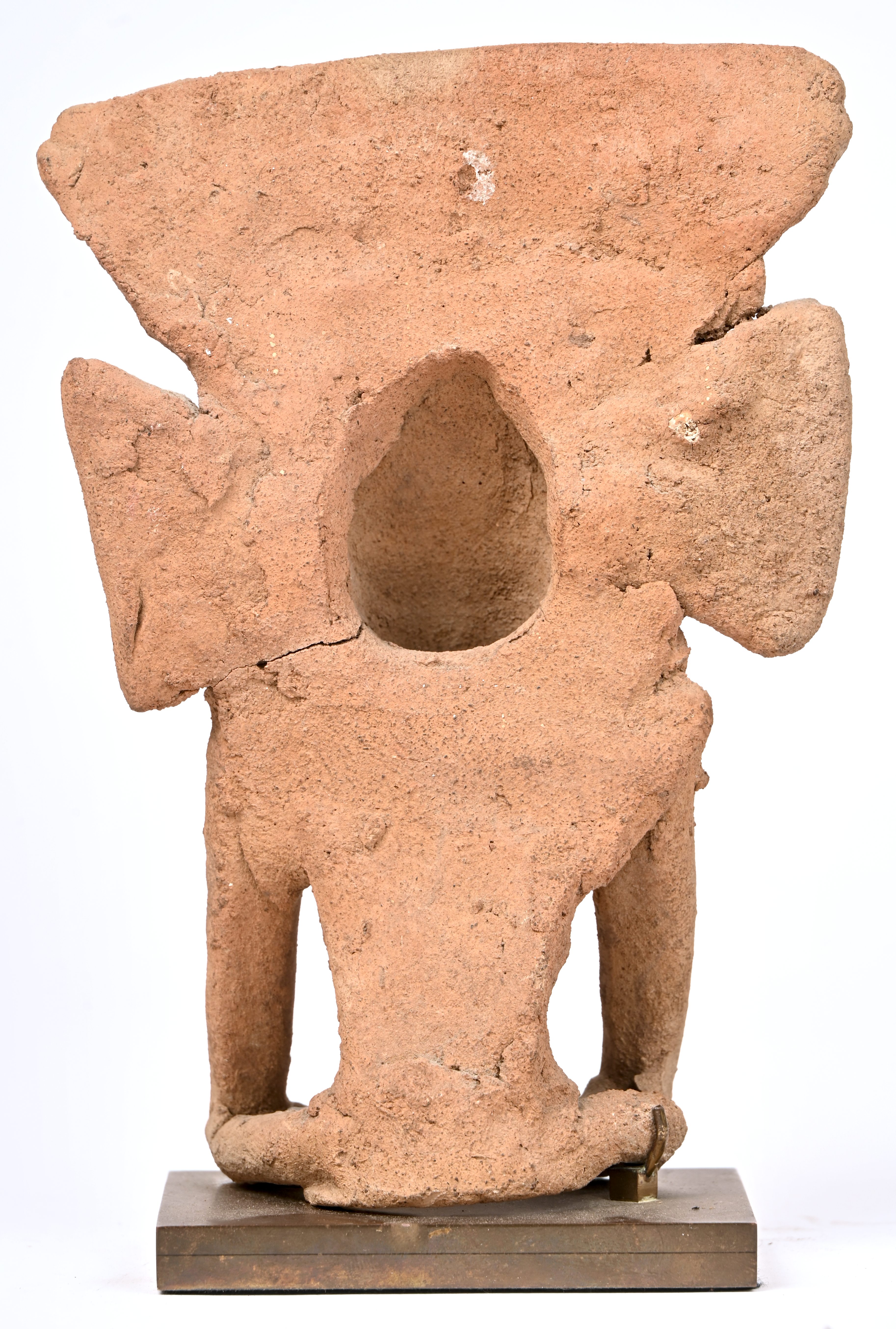 Een aardewerken beeldje in precolumbiaanse stijl van een regen en vruchtbaarheidsgod.