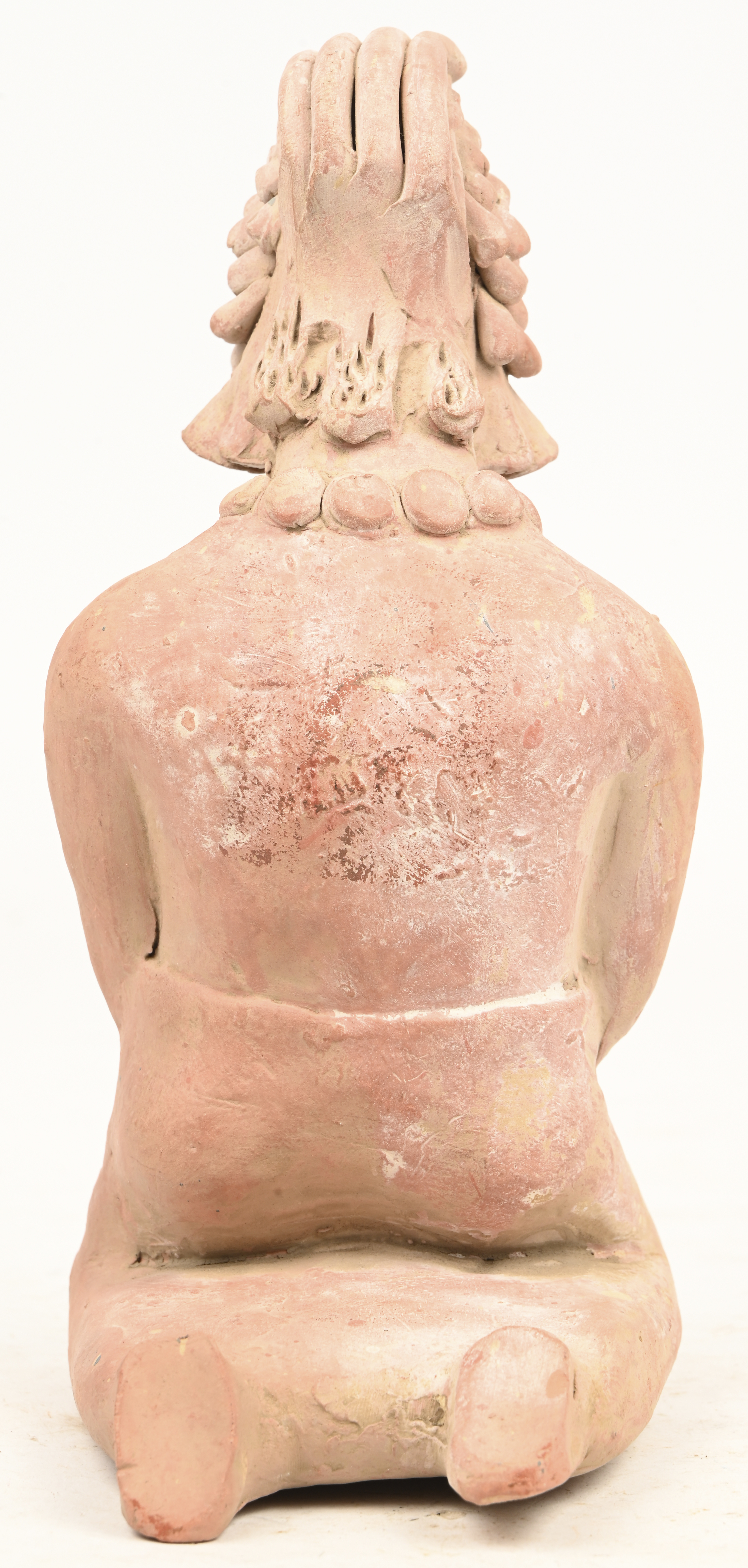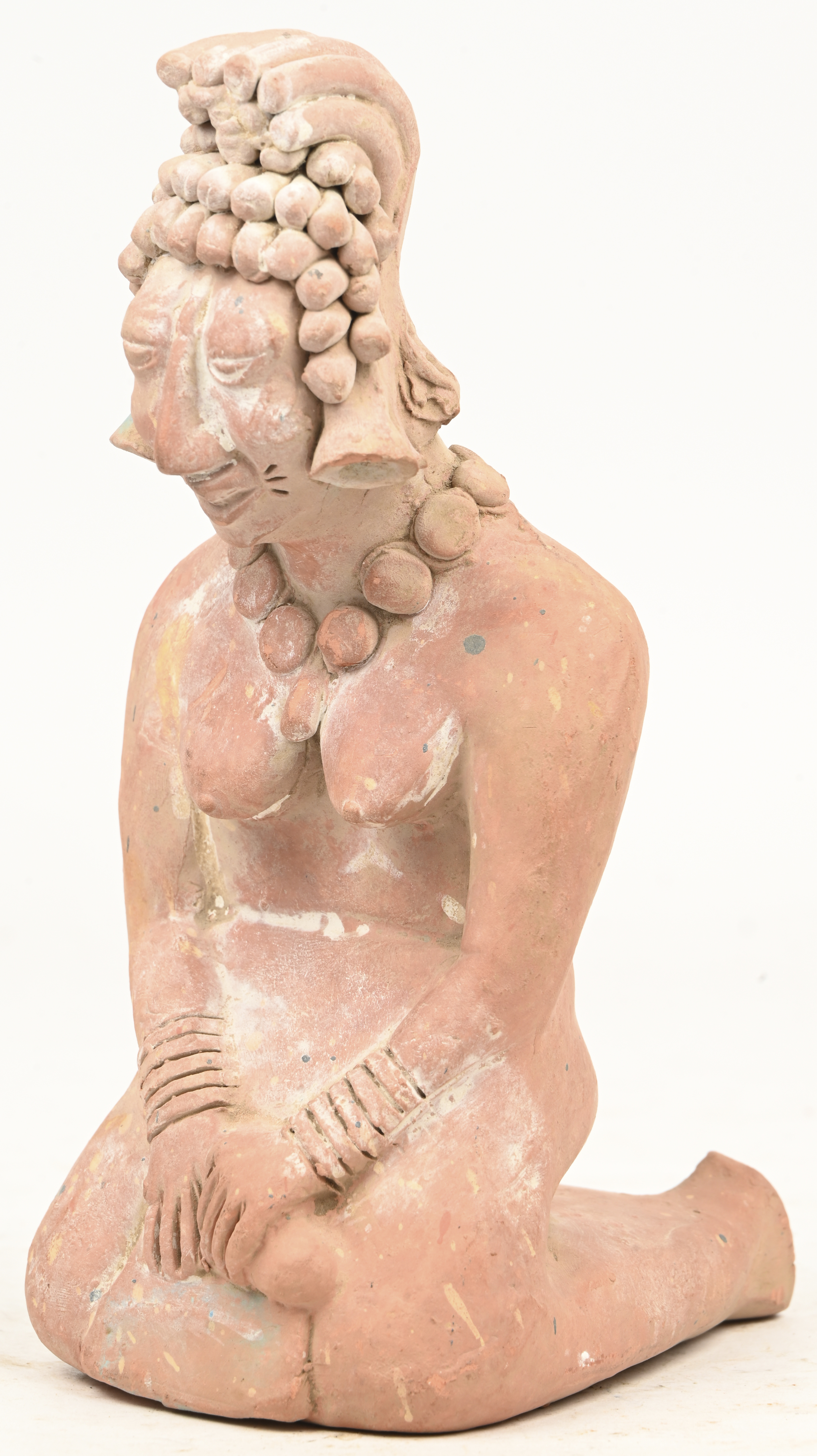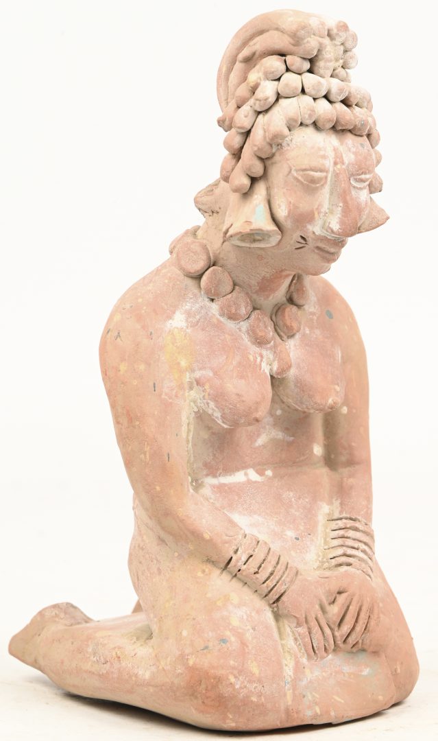 A terracotta figurine of a kneeling woman in Jaina Mayan style.