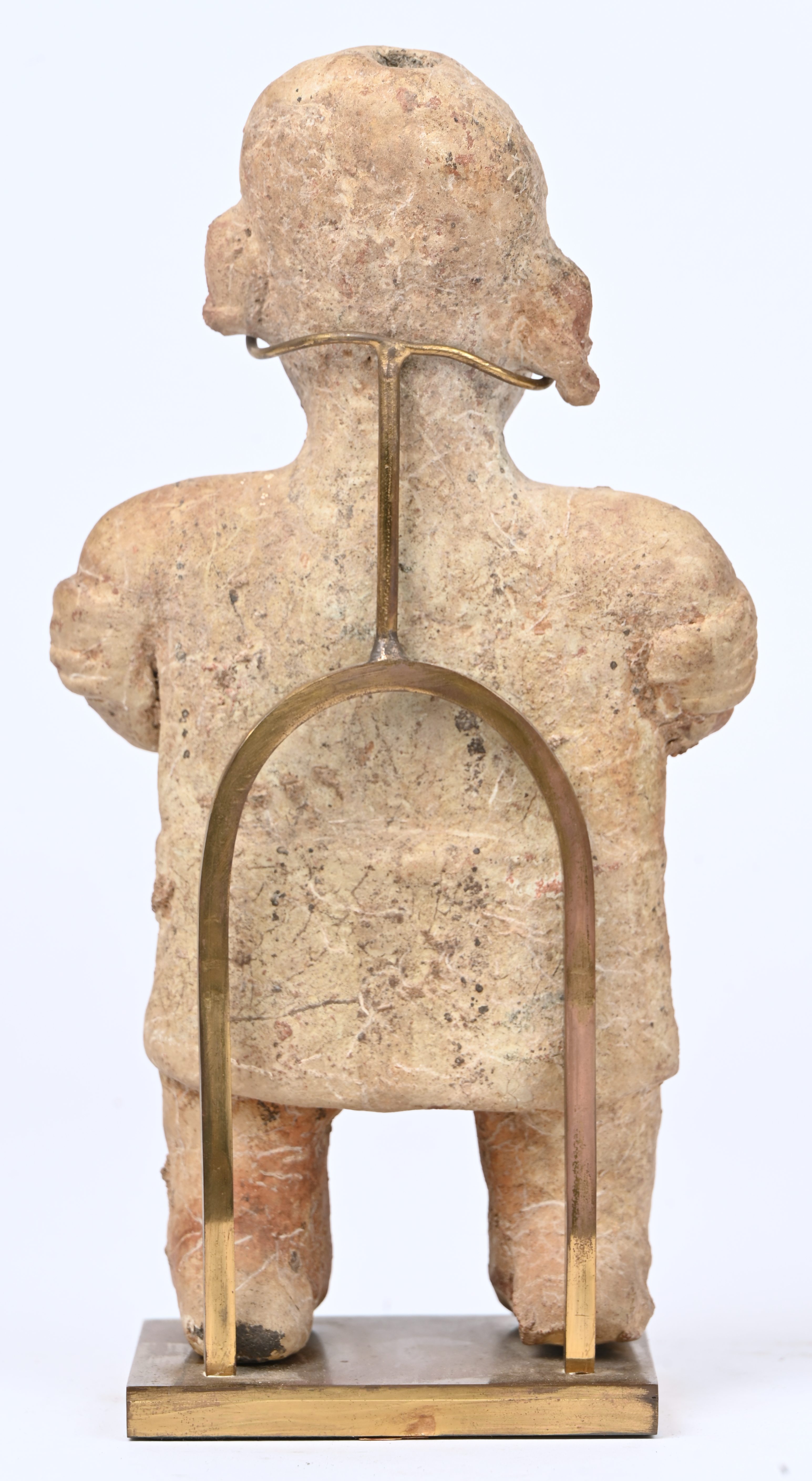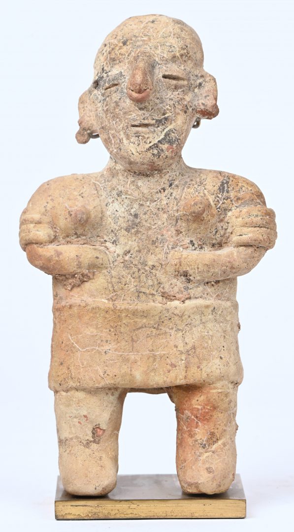 A terracotta figurine of a standing female figure with bracelets and a nose ring, in Pre-Columbian style.