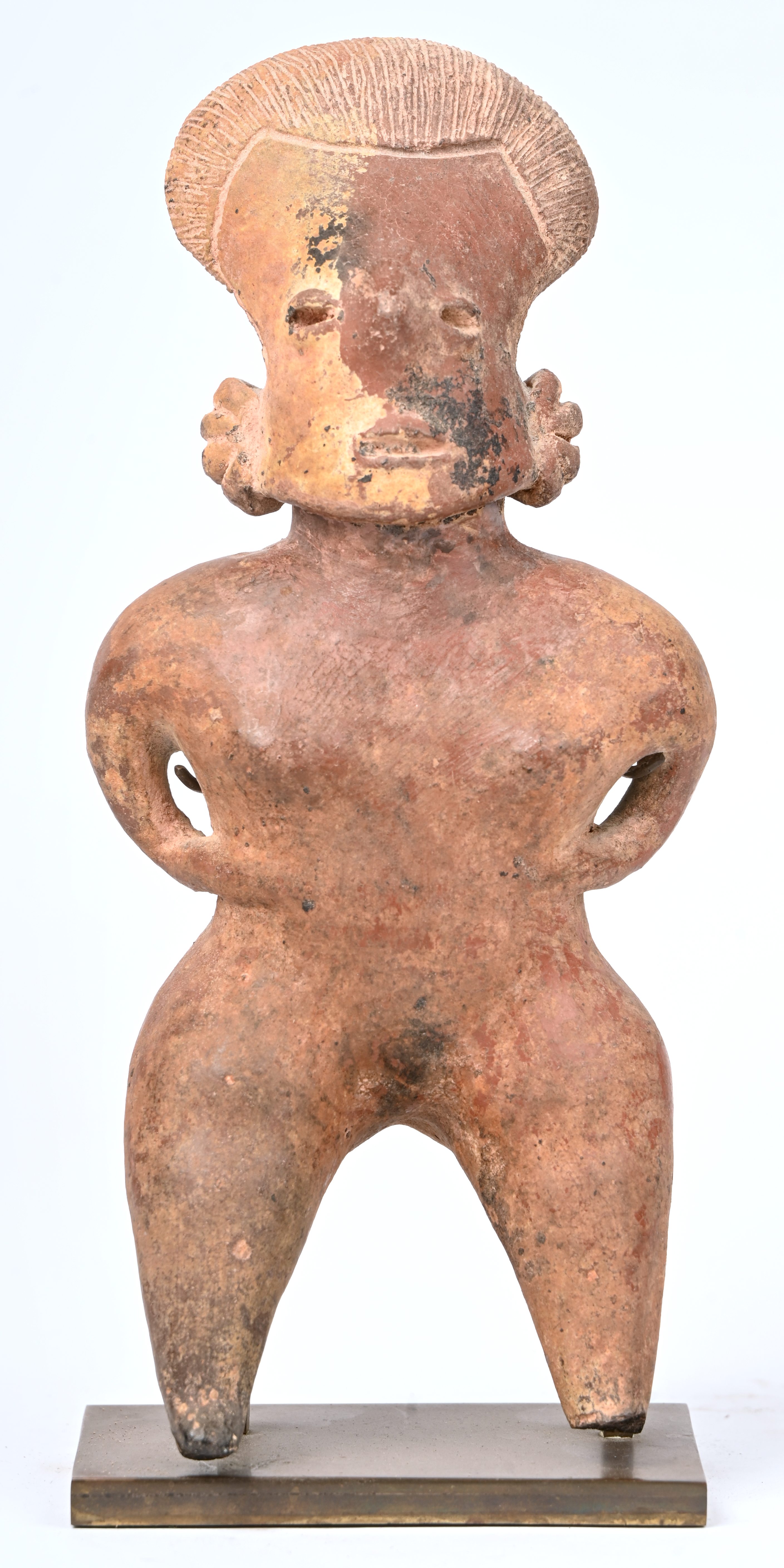 A terracotta figurine of a standing woman with ear ornaments in Pre-Columbian style. With remains of polychrome decoration.