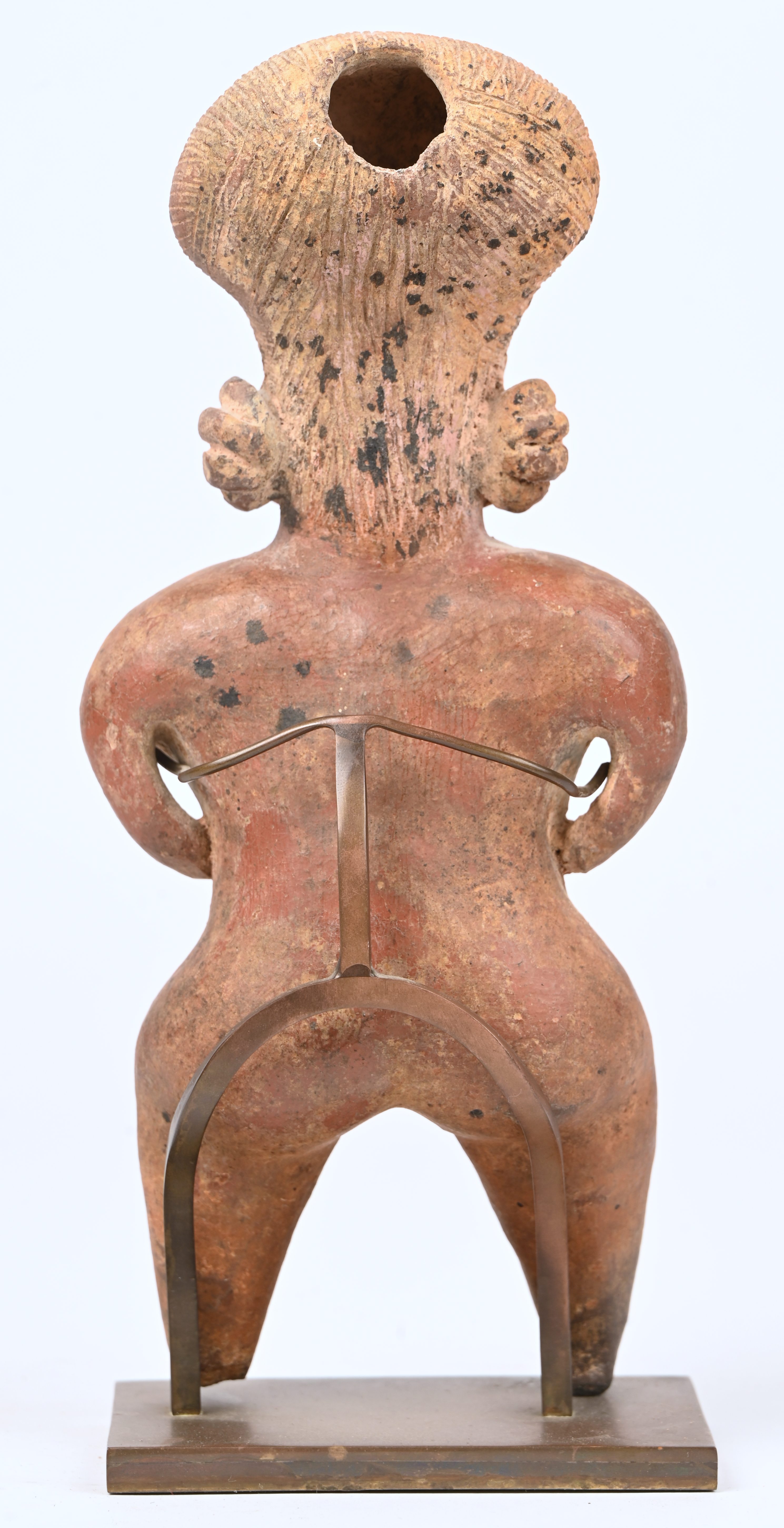 Een aardewerken beeldje van een staande vrouw met oorsierraden in precolumbiaanse stijl. Met resten van polychrome beschildering.