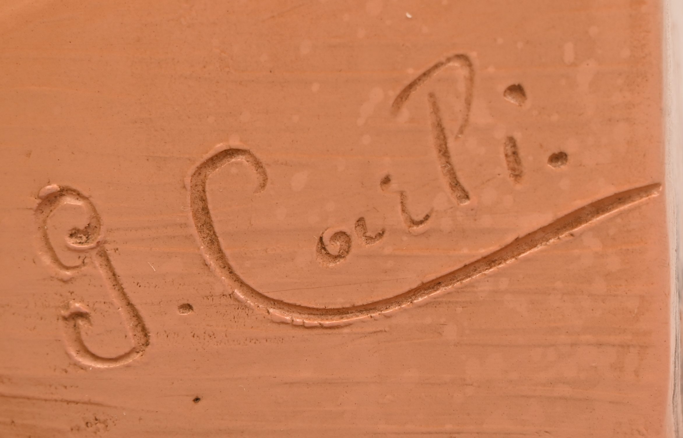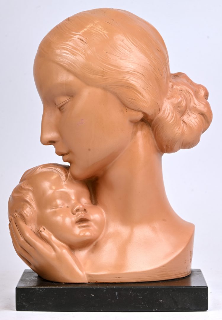 A pottery bust on a marble plinth, Art Deco, signed, numbered 2256 and marked ‘made in Belgium’.