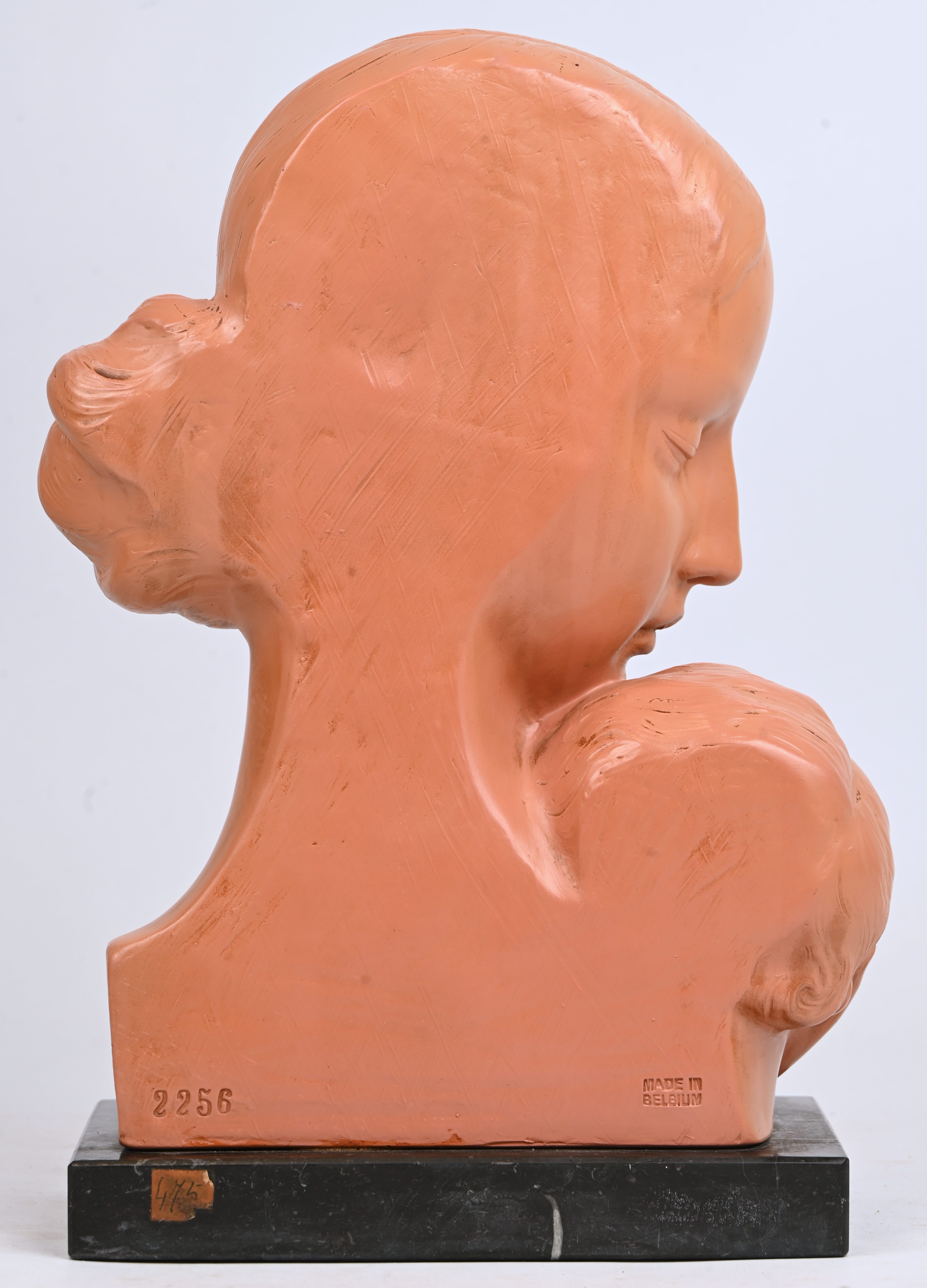 Een aardewerken buste op marmeren sokkel, art deco, gesigneerd, genummerd 2256 en gemerkt ‘made in Belgium’.