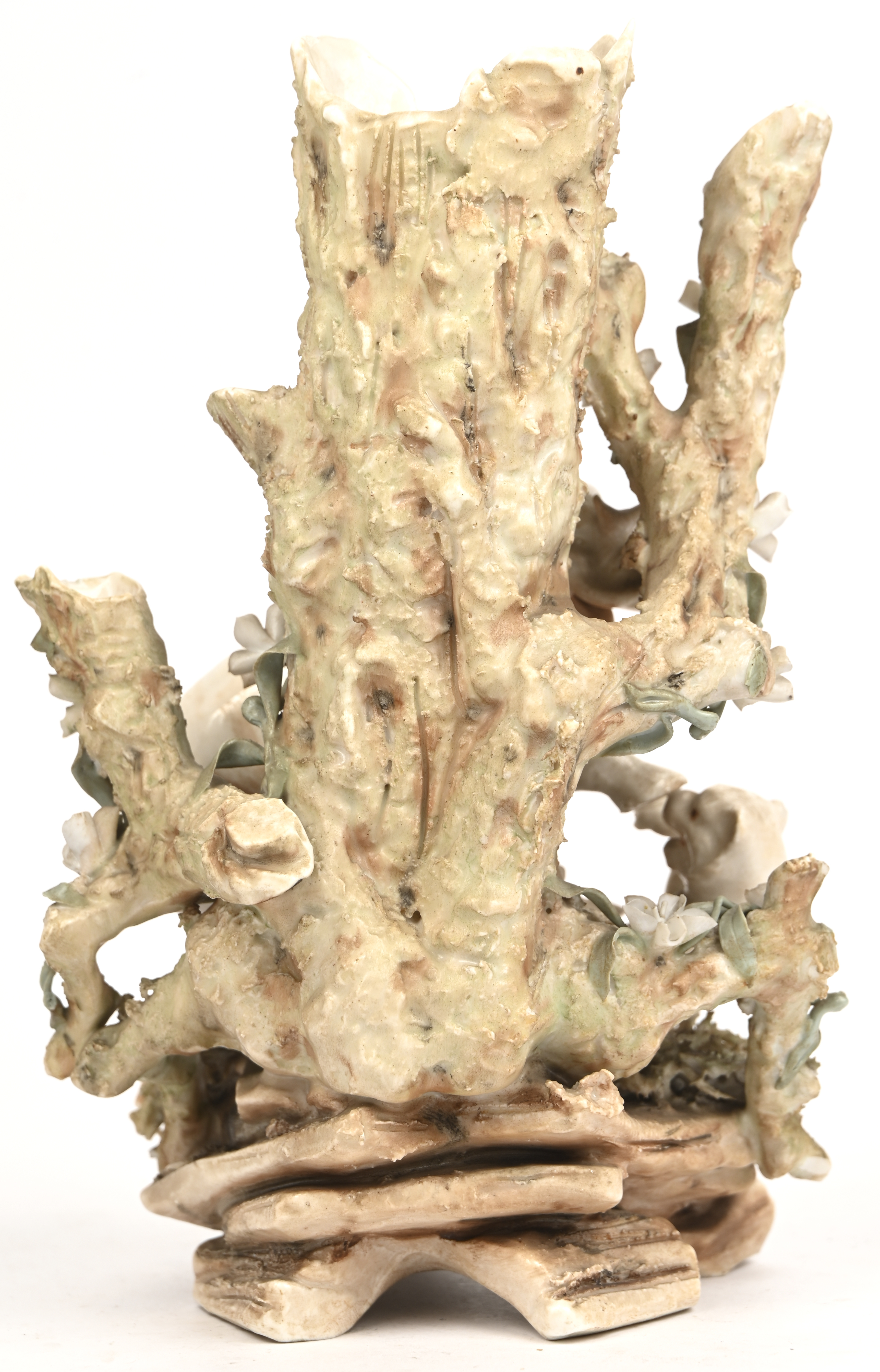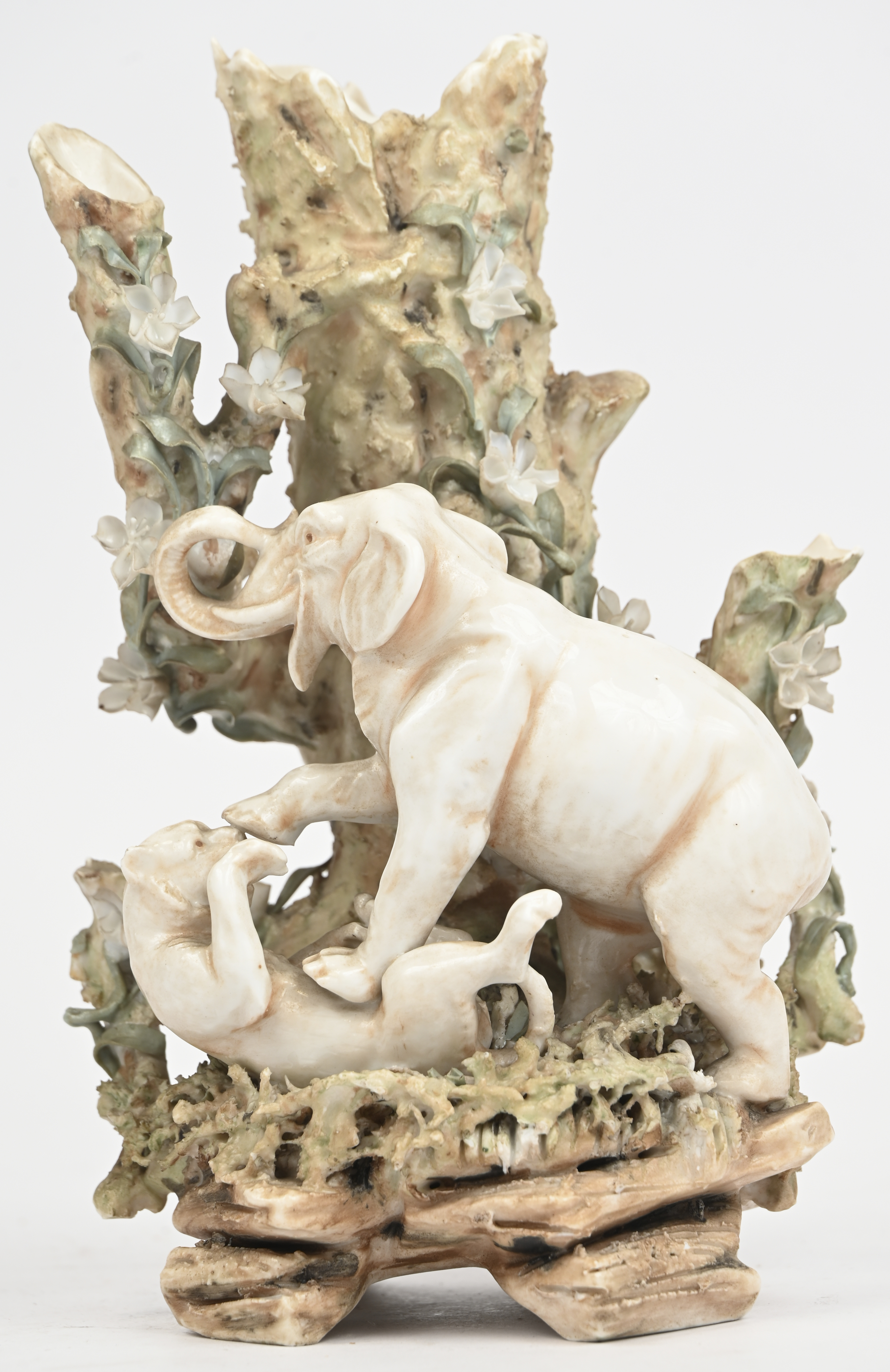 An earthenware vase/figure, early 20th century, depicting an elephant and a tiger fighting by a tree trunk with spring blossoms. In the style of Royal Dux, unsigned.