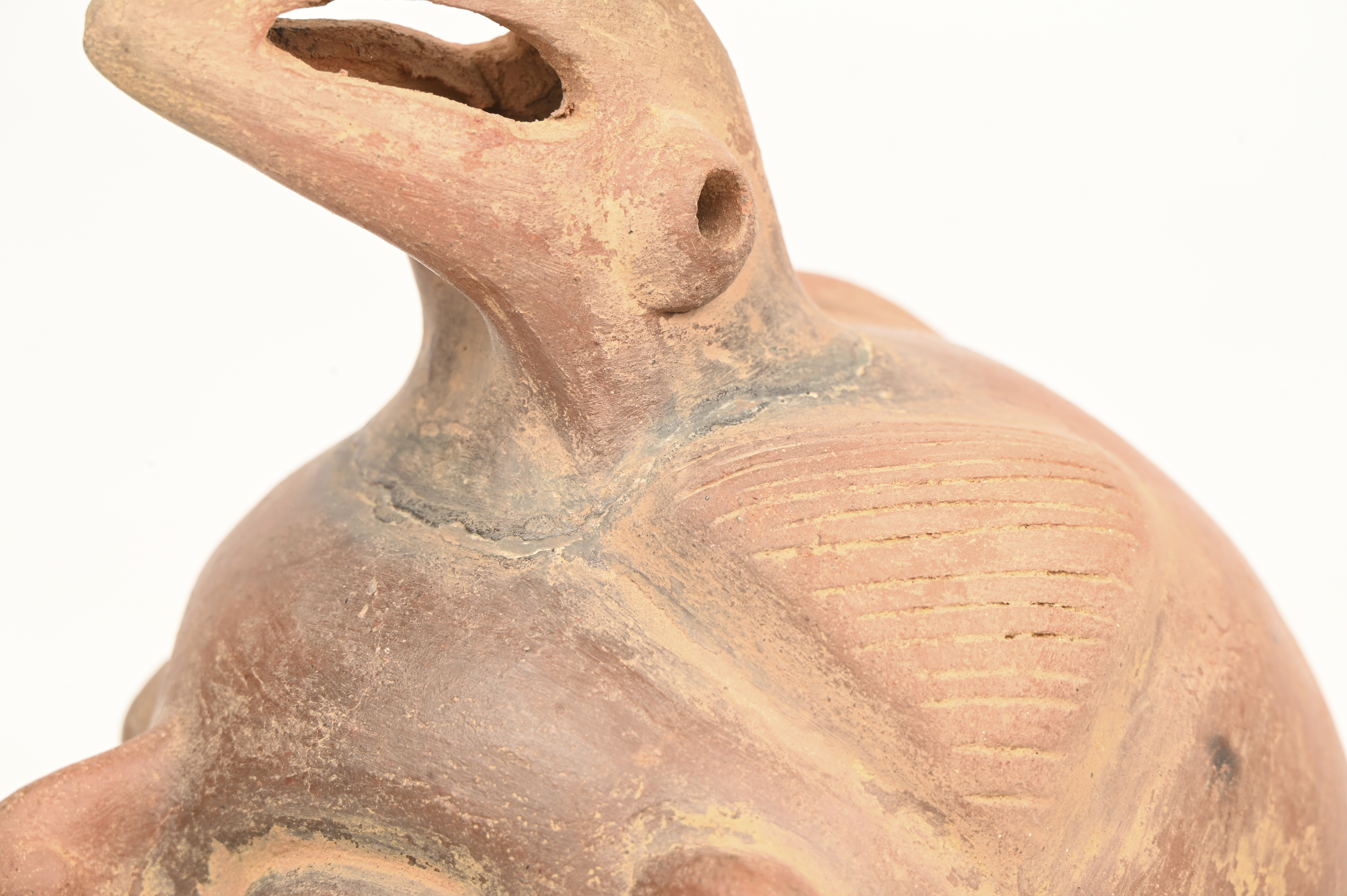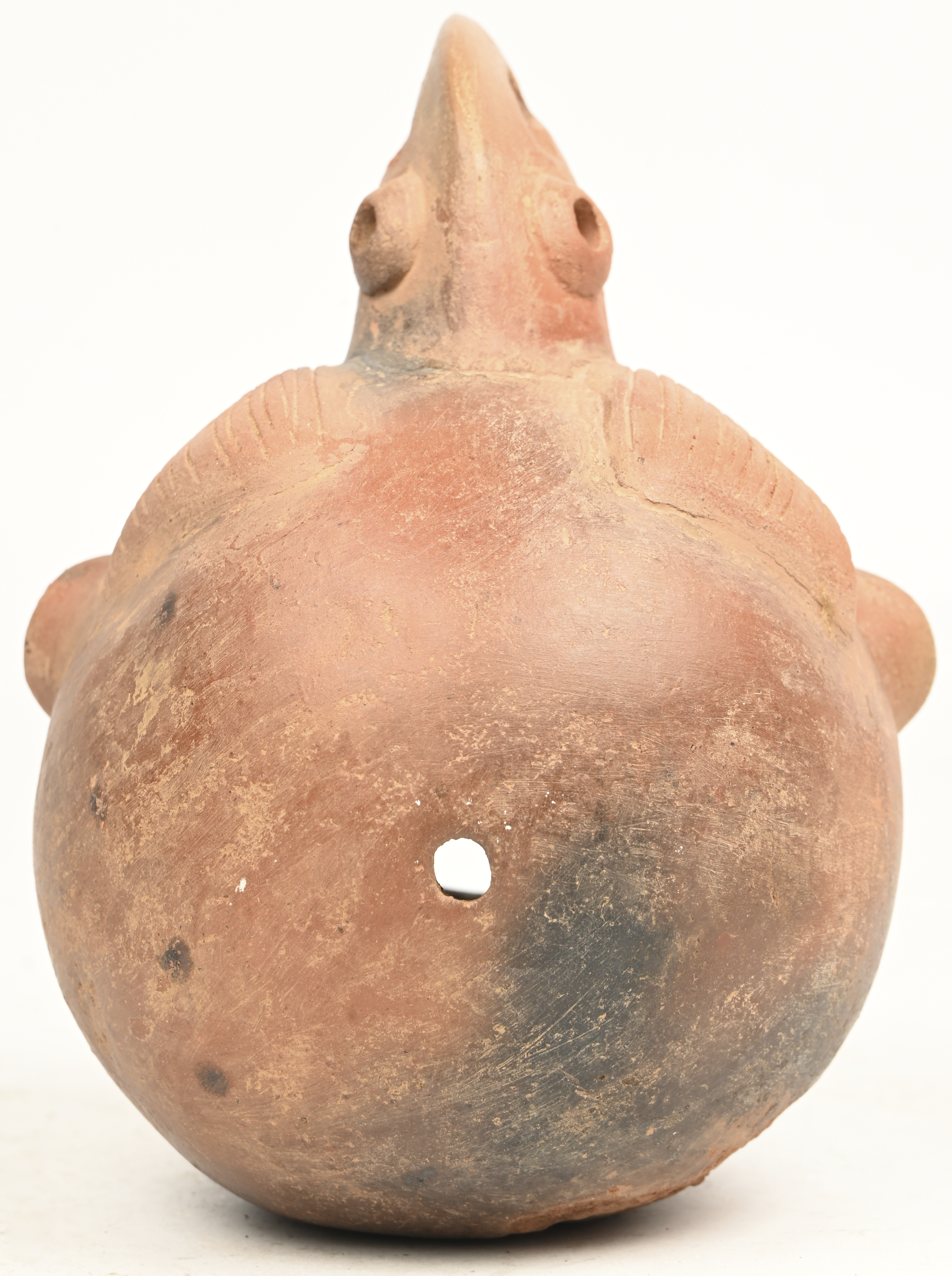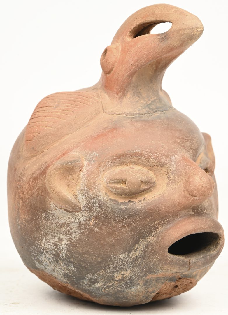 An earthenware Vicus vessel with a face and bird beak at the top in Pre-Columbian style.