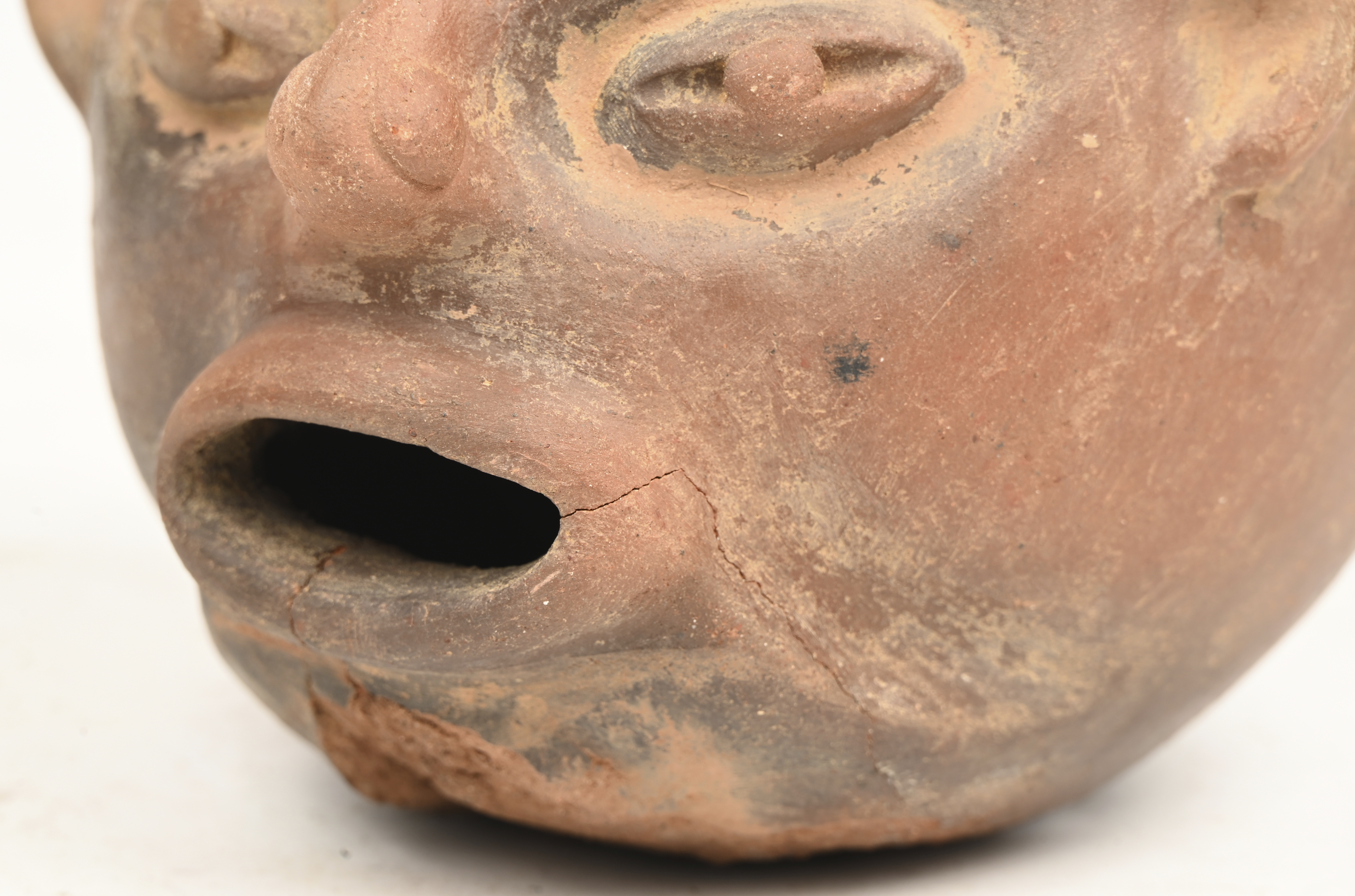 Een aardewerken Vicus hoofdvat met gelaat en vogelbek bovenaan in precolumbiaanse stijl.