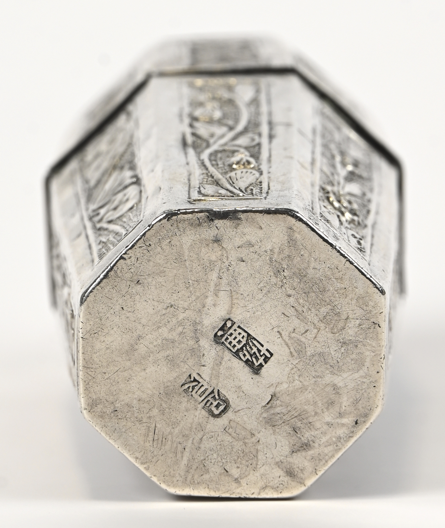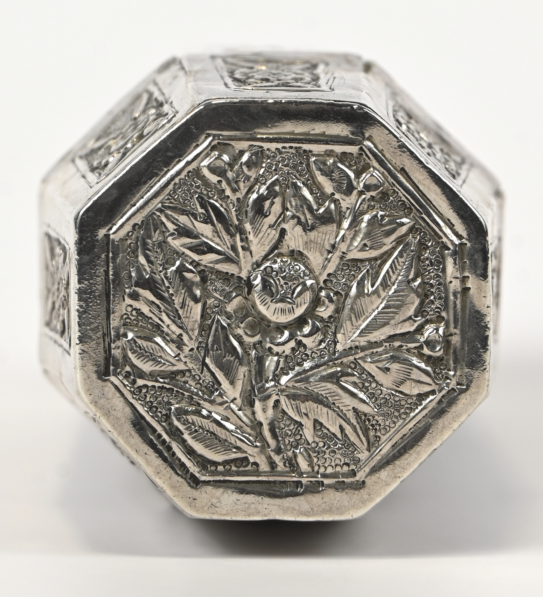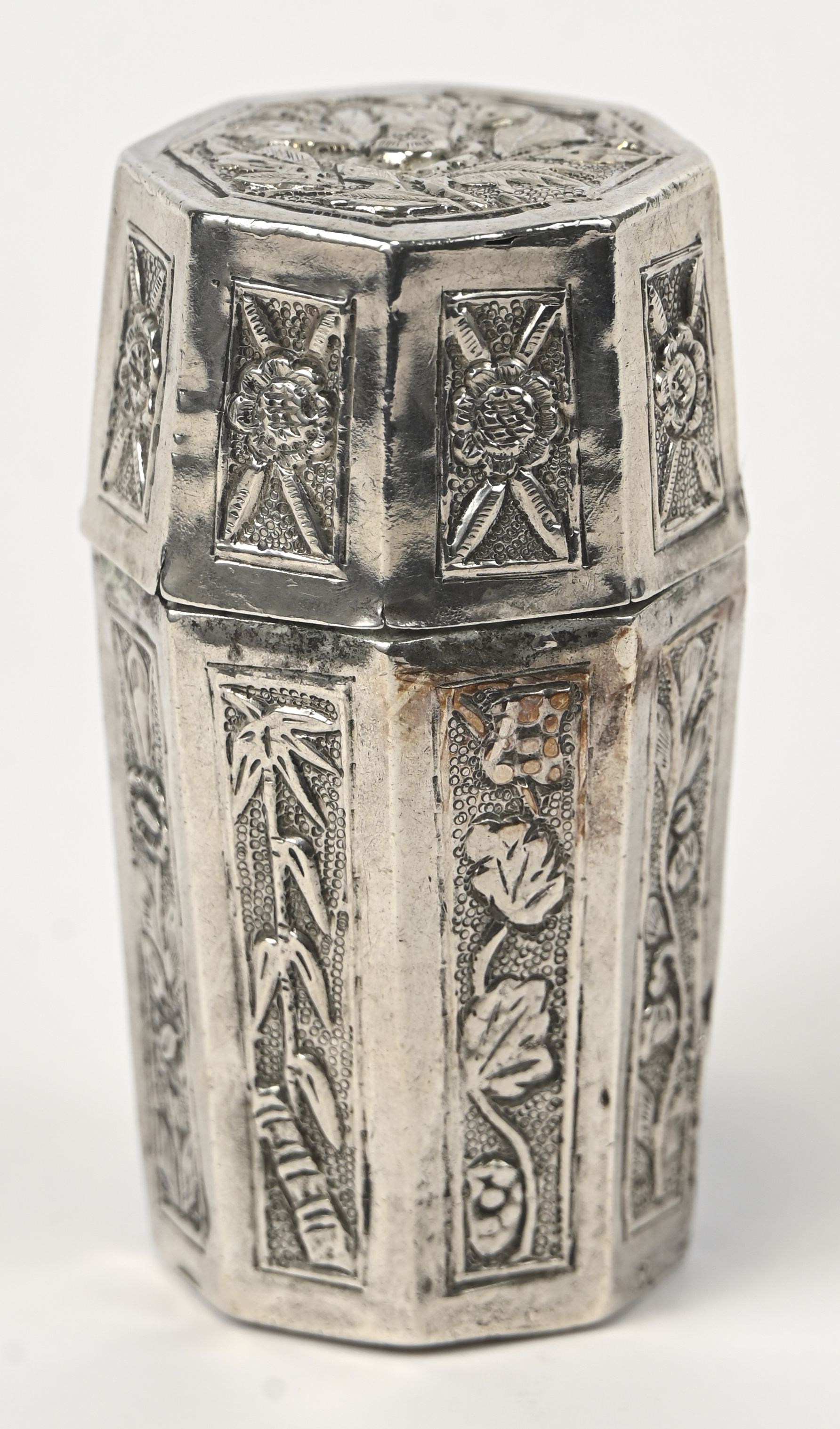 Een achthoekig zilveren kokertje met deksel, gedreven vegetaal decor. Chinese keuren. AR0. 35 g