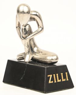 #121Een modern metalen beeld op marmeren sokkel met opschrift Zilli.