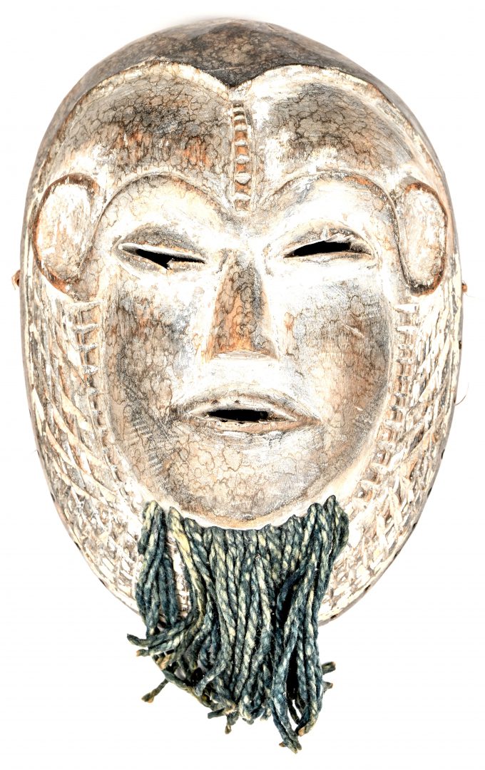 Een Afrikaans houtgesculpteerd masker met blauwe wollen baard, Bas - Nigeria.