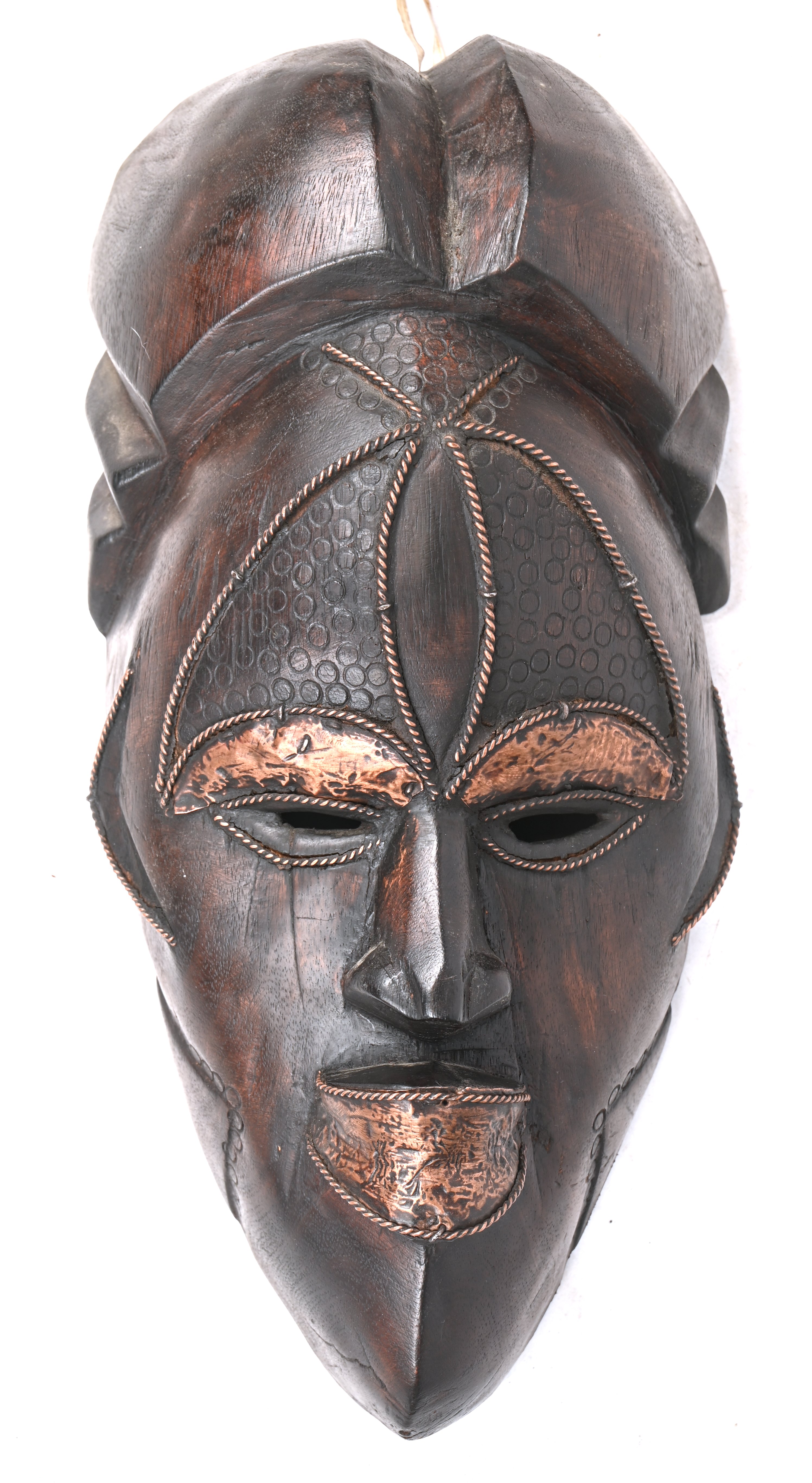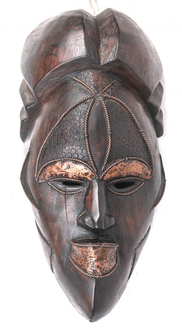 #27Een decoratief Afrikaans masker van hout beslagen met koper.