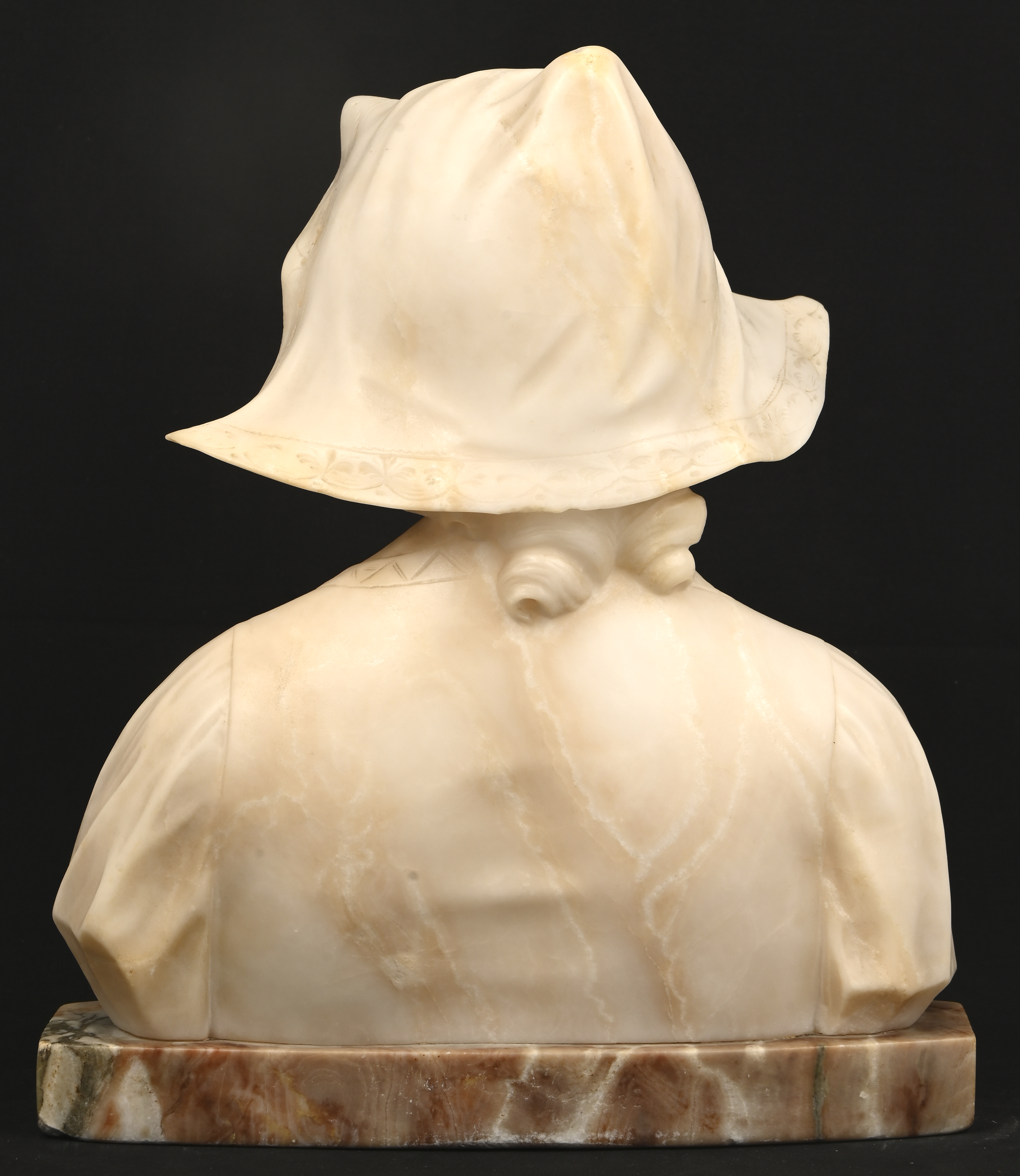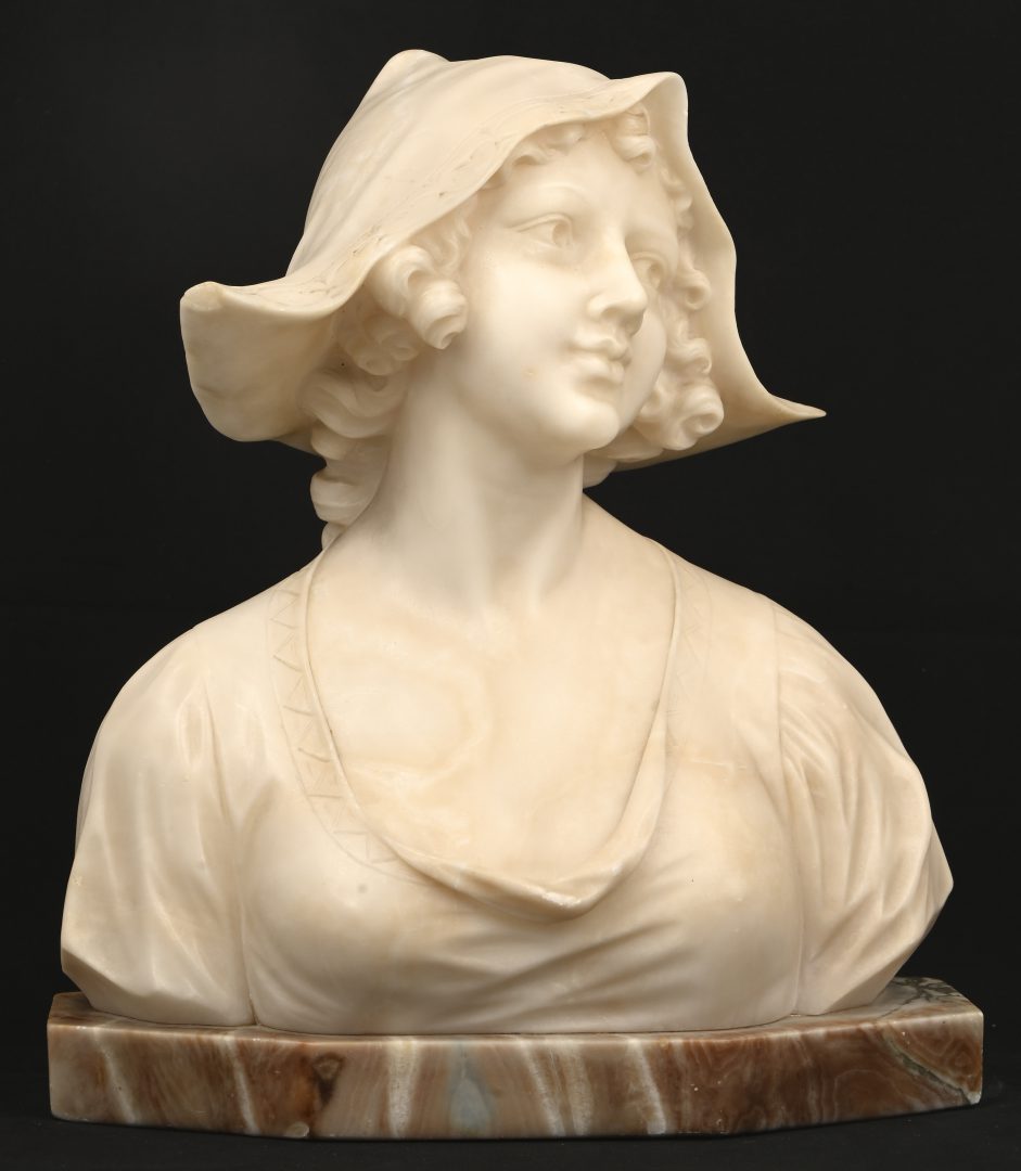 An alabaster bust of a young woman, with a marble base. The sculpture has some damage to the hat.